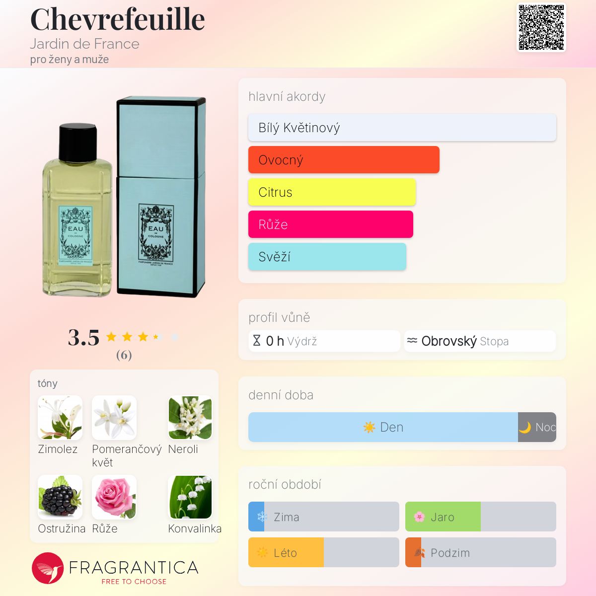 Chevrefeuille podle Jardin de France je Floral vůně pro ženy a muže. "Nosem" za touto vůní je Expressions Parfumees Grasse. Vrchní tón je Neroli ; střední tóny jsouZimolez, Květ afrického pomeranče, Růže, Konvalinka a Jasmín ; základní tóny jsou Ostružina, Vetiver a Pižmo.