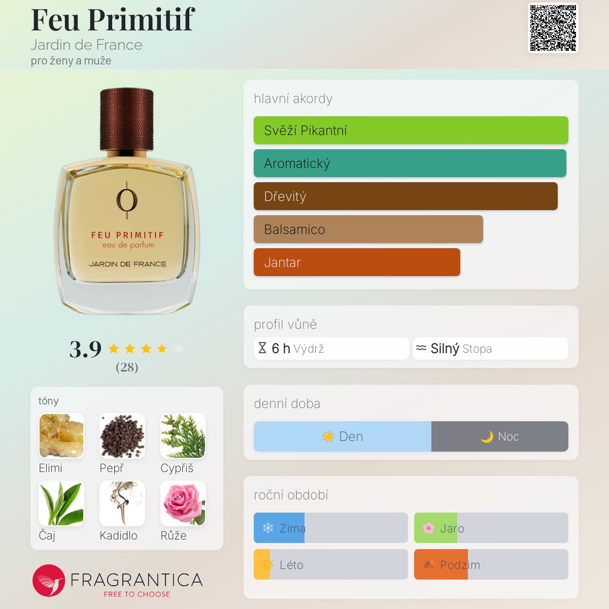 Feu Primitif podle Jardin de France je Woody Spicy vůně pro ženy a muže. Feu Primitif byl/a uveden/a v roce 2018. "Nosem" za touto vůní je Justine Brivet. Vrchní tóny jsou Elimi, Pepř a Pomeranč; střední tóny jsouČerný čaj a Růže ; základní tóny jsou Cypřiš, Kadidlo a Virginský cedr.