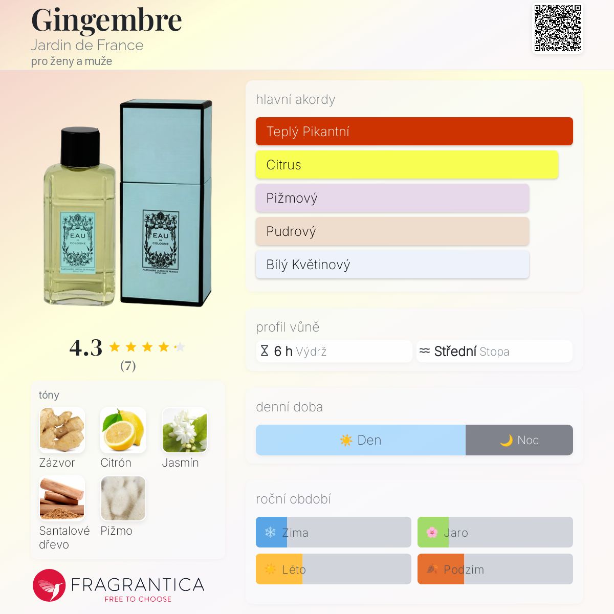 Gingembre podle Jardin de France je Aromatic Spicy vůně pro ženy a muže. Vrchní tóny jsou Zázvor a Citron amalfi; střední tón jeJasmín ; základní tóny jsou Santalové dřevo a Pižmo.