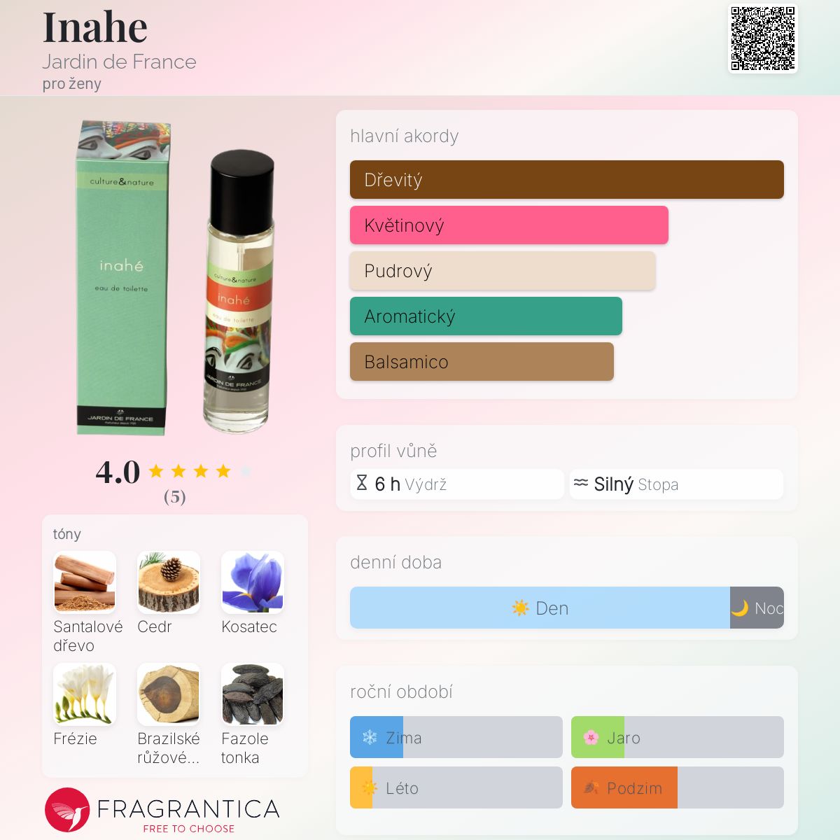 Inahe podle Jardin de France je Woody Floral Musk vůně pro ženy. Inahe byl/a uveden/a v roce 2008. "Nosem" za touto vůní je Expressions Parfumees Grasse. Vrchní tóny jsou Černý rybíz a Pryskyřice elemi; střední tóny jsouKosatec, Frézie, Len setý a Růže ; základní tóny jsou Santalové dřevo, Virginský cedr, Brazilské růžové dřevo, Fazole tonka a Pižmo.