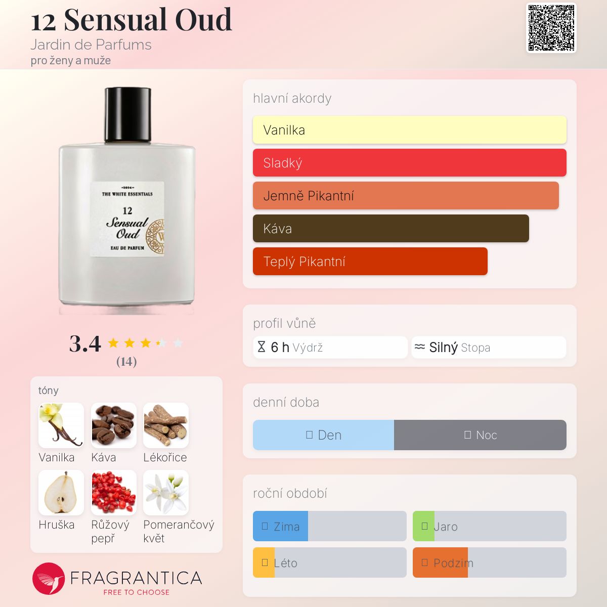 12 Sensual Oud podle Jardin de Parfums je Orientální vůně pro ženy a muže. Vrchní tóny jsou Hruška, Růžový pepř a Pomerančový květ; střední tóny jsouKáva, Lékořice, Jasmín a Mandle ; základní tóny jsou Vanilka, Pačuli, Cedr a Agarové dřevo (oud).