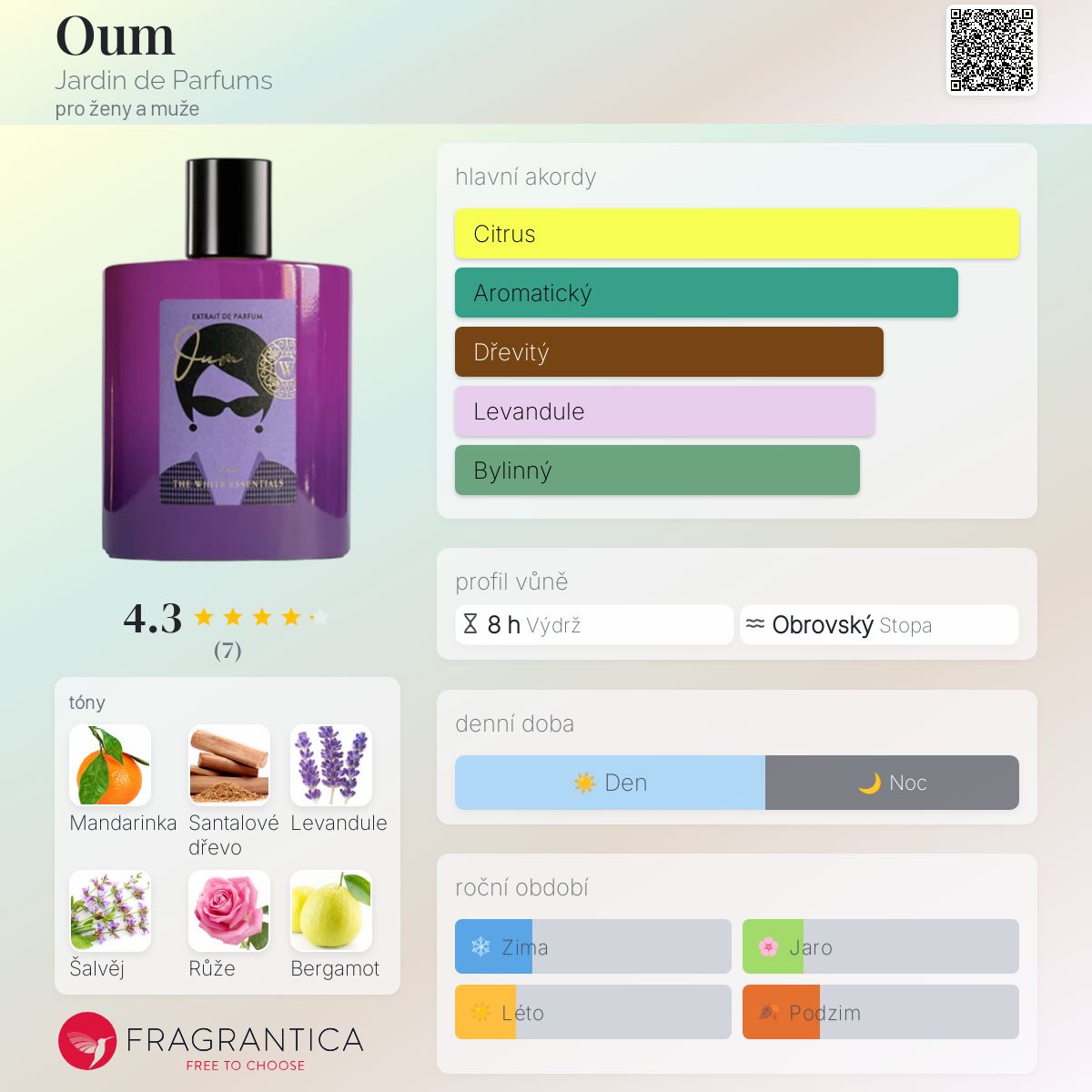 Oum podle Jardin de Parfums je Floral Fruity vůně pro ženy a muže. Toto je nová vůně. Oum byl/a uveden/a v roce 2024. Vrchní tóny jsou Mandarinka a Bergamot; střední tóny jsouSantalové dřevo, Růže a Jasmín ; základní tóny jsou Levandule a Šalvěj.