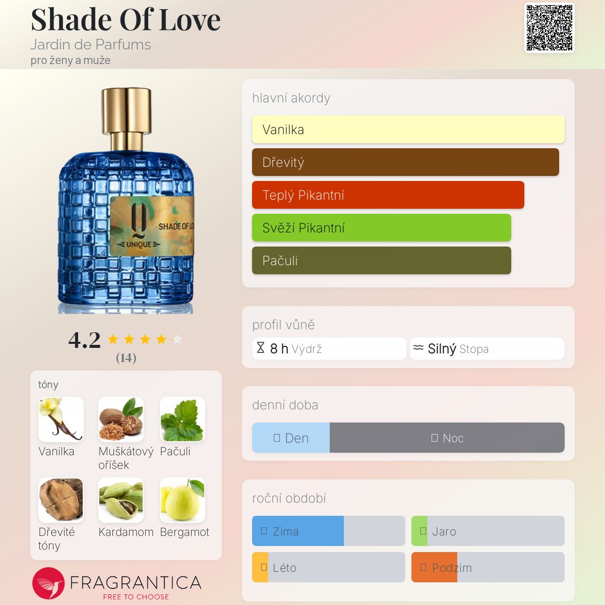 Shade Of Love podle Jardin de Parfums je Orientální Woody vůně pro ženy a muže. Vrchní tóny jsou Kardamom a Bergamot; střední tóny jsouVanilka a Pačuli ; základní tóny jsou Muškátový oříšek a Dřevité tóny.
