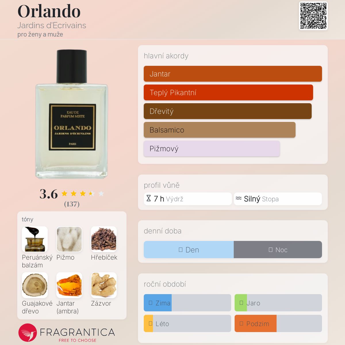 Orlando podle Jardins d’Ecrivains je Woody Spicy vůně pro ženy a muže. Orlando byl/a uveden/a v roce 2013. "Nosem" za touto vůní je Anais Biguine. Vrchní tóny jsou Zázvor, Růžový pepř a Pomeranč; střední tóny jsouHřebíček, Jantar (ambra) a Pačuli ; základní tóny jsou Peruánský balzám, Pižmo a Guajakové dřevo.