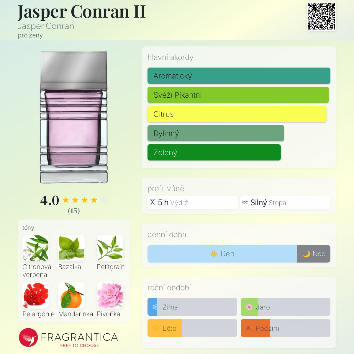 Jasper Conran II podle Jasper Conran je Floral Fruity vůně pro ženy. Vrchní tóny jsou Citronová verbena, Bazalka a Petitgrain; střední tóny jsouPelargónie, Mandarinka a Jasmín ; základní tóny jsou Pivoňka, Vetiver a Pižmo.