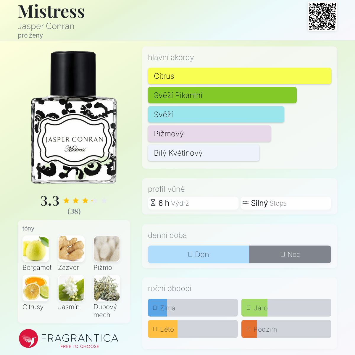 Mistress podle Jasper Conran je Orientální Floral vůně pro ženy. Mistress byl/a uveden/a v roce 2007. Vrchní tóny jsou Bergamot, Zázvor, Citrusy a Aldehydy; střední tóny jsouJasmín, Lotus, Růže a Ylang-Ylang ; základní tóny jsou Pižmo, Dubový mech, Jantar (ambra), Sušené ovoce a Cedr.