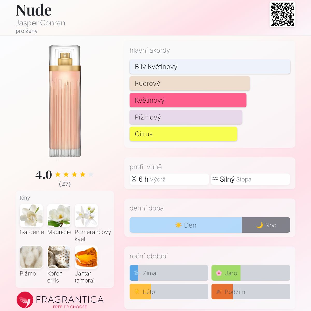 Nude podle Jasper Conran je Floral vůně pro ženy. Nude byl/a uveden/a v roce 2016. Vrchní tón je Gardénie ; střední tóny jsouMagnólie a Pomerančový květ ; základní tóny jsou Pižmo, Orris a Jantar (ambra).