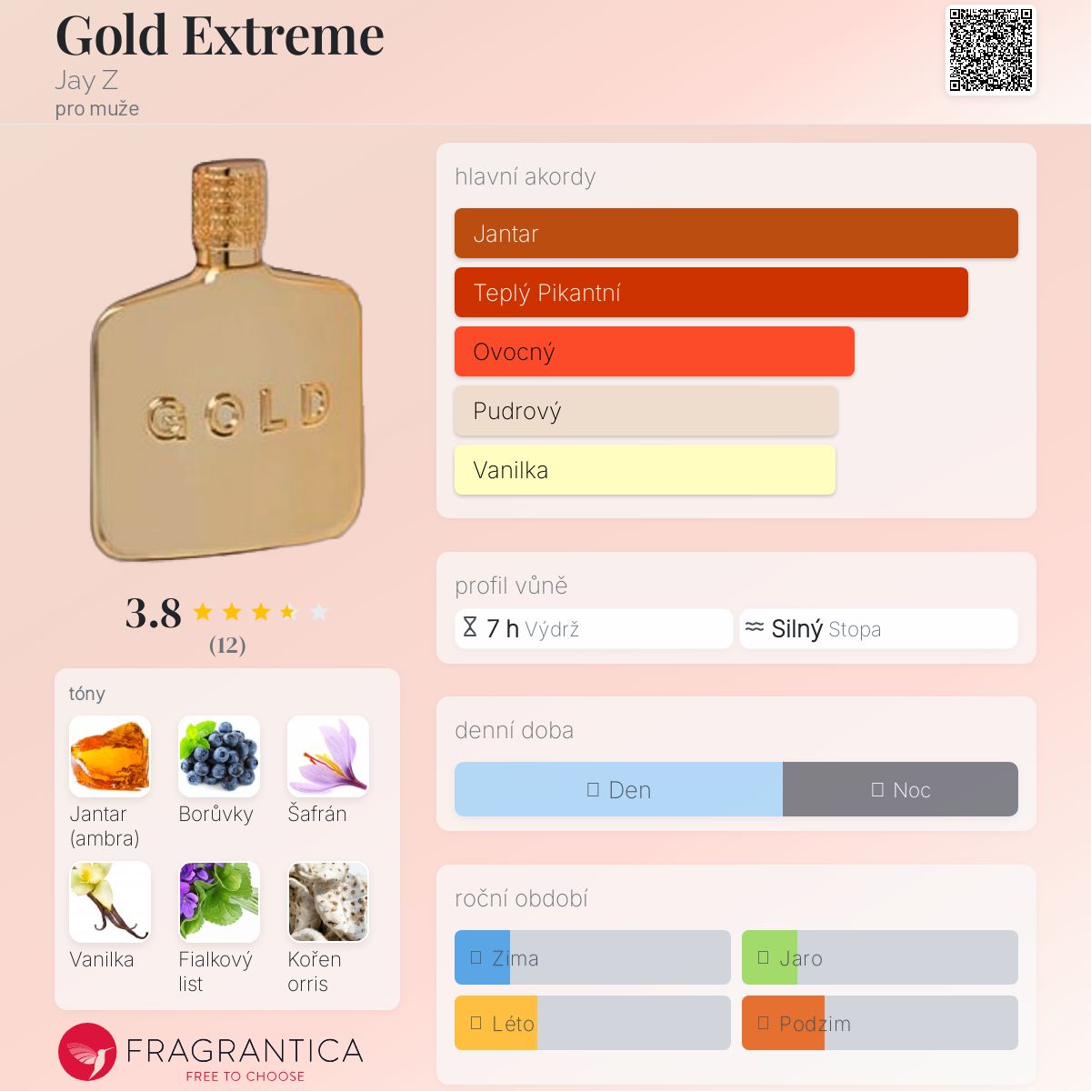 Gold Extreme podle Jay Z je Aromatic Fougere vůně pro muže. Gold Extreme byl/a uveden/a v roce 2015. "Nosem" za touto vůní je Ilias Ermenidis. Vrchní tóny jsou Borůvky, Grapefruit, Sicilský bergamot, Kardamom a Zázvor; střední tóny jsouŠafrán, Fialkový list, Kořen orris a Levandule ; základní tóny jsou Jantar (ambra), Vanilka, Myrha, Týkové dřevo a Vetiver.
