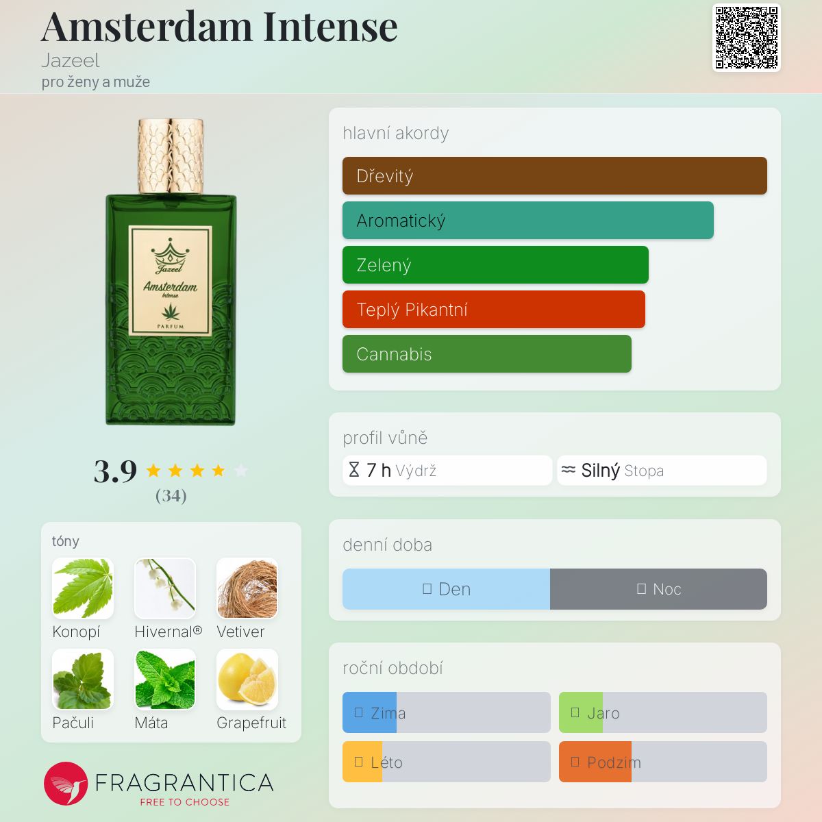Amsterdam Intense podle Jazeel je Aromatic Green vůně pro ženy a muže. Amsterdam Intense byl/a uveden/a v roce 2022. "Nosem" za touto vůní je Shadi Samra. Vrchní tóny jsou Konopí, Máta, Grapefruit, Šafrán a Ovocné tóny; střední tóny jsouHivernal®, Bílé květy, Kadidlo, Santalové dřevo, Guajakové dřevo a Bulharská růže ; základní tóny jsou Vetiver, Pačuli, Dřevité tóny, Kambodžský oud a Jantar (ambra).