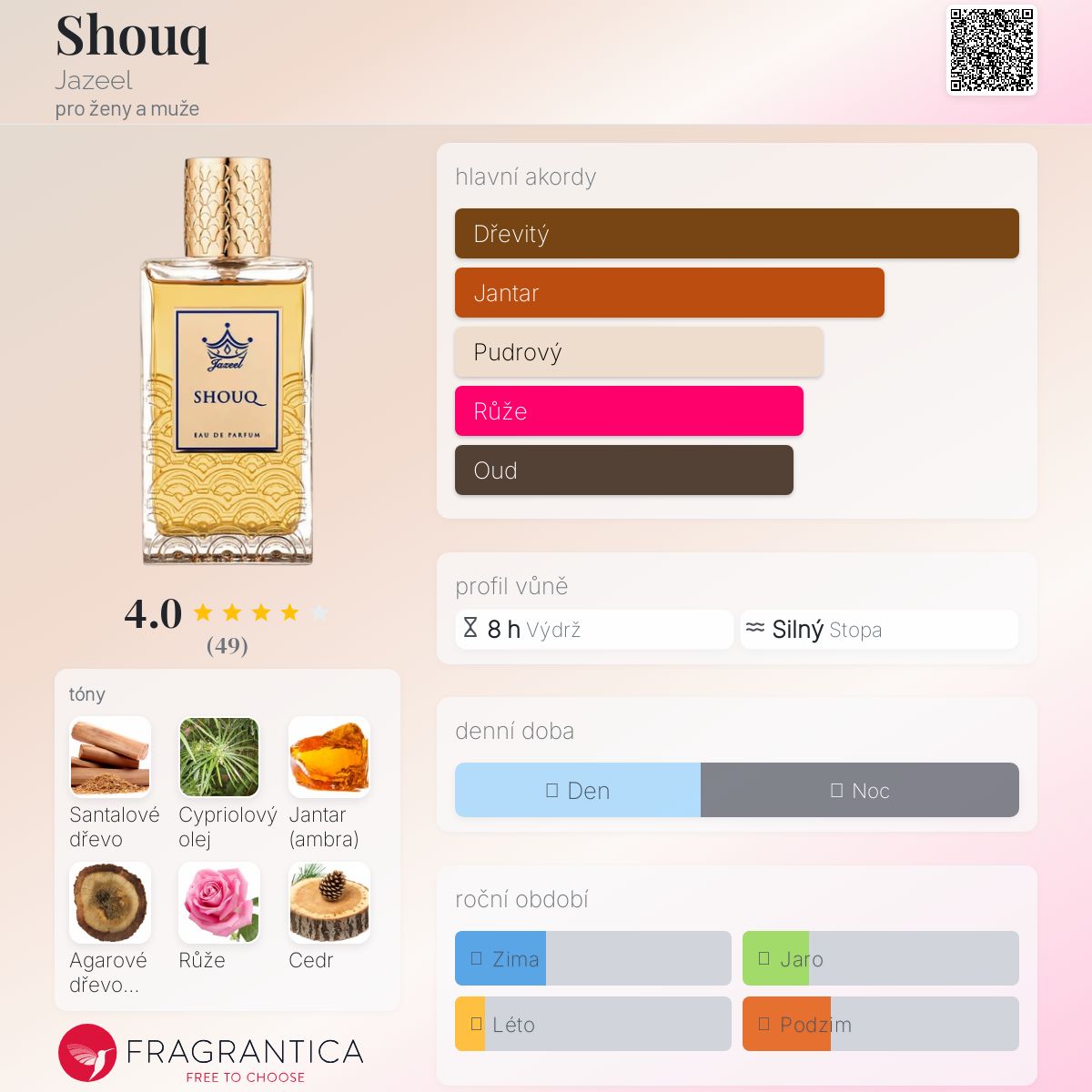 Shouq podle Jazeel je Orientální Floral vůně pro ženy a muže. Shouq byl/a uveden/a v roce 2020. Vrchní tóny jsou Růže, Konvalinka a Pelargónie; střední tóny jsouCypriolový olej, Jantar (ambra), Cedr a Copahu balzám ; základní tóny jsou Santalové dřevo, Agarové dřevo (oud), Pižmo a Vetiver.