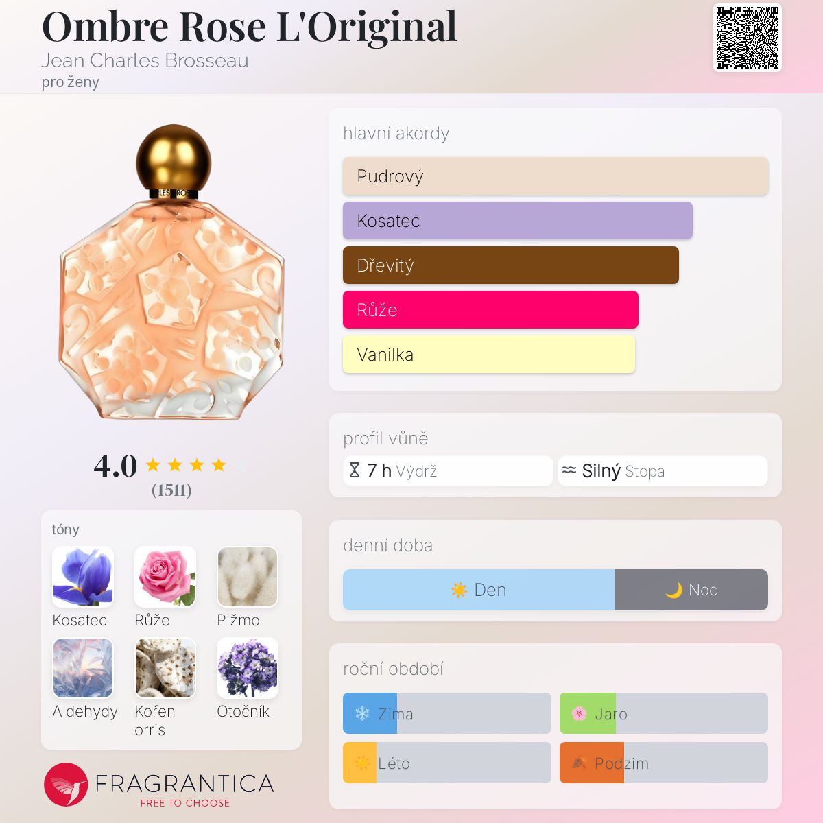 Ombre Rose L'Original podle Jean Charles Brosseau je Floral vůně pro ženy. Ombre Rose L'Original byl/a uveden/a v roce 1981. "Nosem" za touto vůní je Francoise Caron. Vrchní tóny jsou Aldehydy, Brazilské růžové dřevo, Pelargónie a Broskev; střední tóny jsouRůže, Kořen kosatce, Santalové dřevo, Ylang-Ylang, Vetiver, Cedr a Konvalinka ; základní tóny jsou Kosatec, Pižmo, Otočník, Fazole tonka, Med, Vanilka a Skořice.