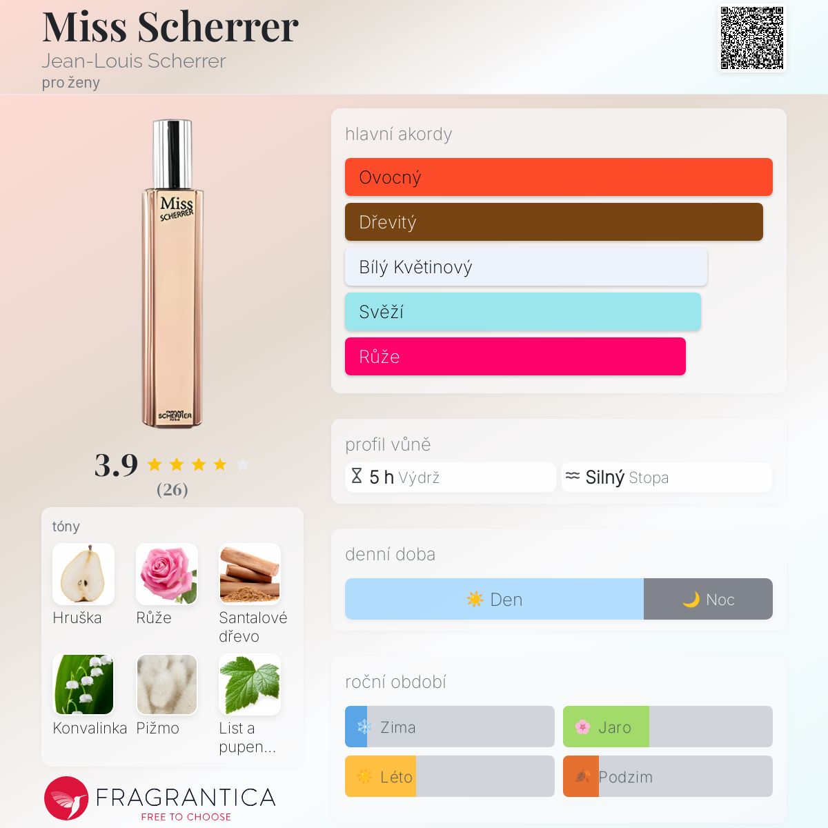Miss Scherrer podle Jean-Louis Scherrer je Floral Woody Musk vůně pro ženy. Miss Scherrer byl/a uveden/a v roce 2008. Vrchní tóny jsou Hruška, Černý rybíz a Citron amalfi; střední tóny jsouRůže, Konvalinka a Květ tiare ; základní tóny jsou Santalové dřevo, Pižmo a Cedr.