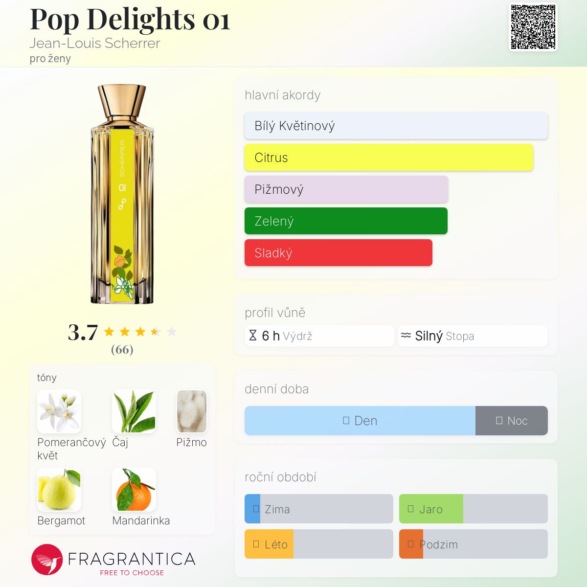 Pop Delights 01 podle Jean-Louis Scherrer je Citrus Aromatic vůně pro ženy. Pop Delights 01 byl/a uveden/a v roce 2017. "Nosem" za touto vůní je Mathilde Bijaoui. Vrchní tóny jsou Bergamot a Zelená mandarinka; střední tóny jsouPomerančový květ, Zelený čaj a Ledový čaj ; základní tón je Pižmo.