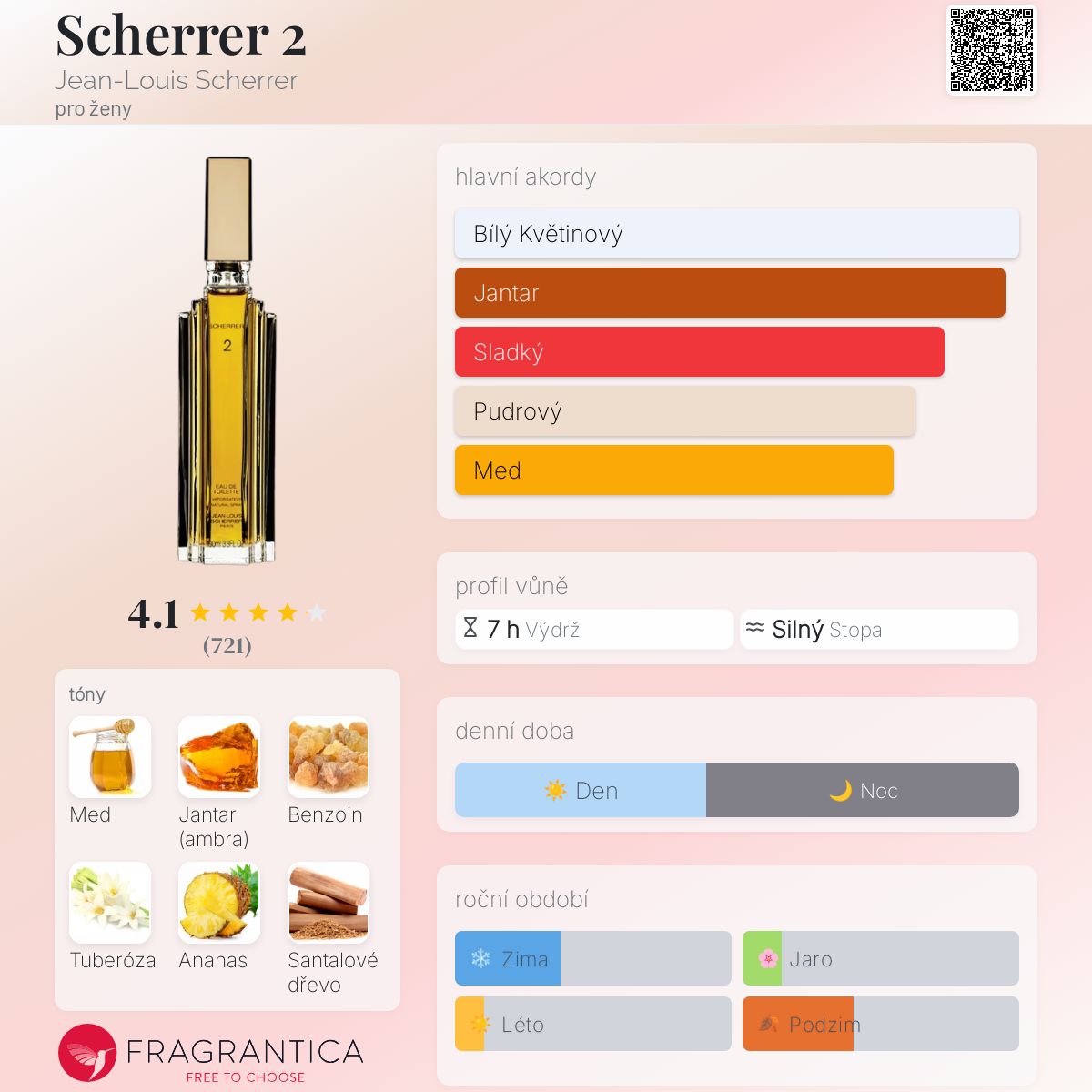 Scherrer 2 podle Jean-Louis Scherrer je Orientální Floral vůně pro ženy. Scherrer 2 byl/a uveden/a v roce 1986. Vrchní tóny jsou Ananas, Anýz, Mandarinka a Bergamot; střední tóny jsouMed, Tuberóza, Jasmín, Růže, Lilie a Konvalinka ; základní tóny jsou Jantar (ambra), Benzoin, Santalové dřevo, Pižmo, Otočník a Vanilka.