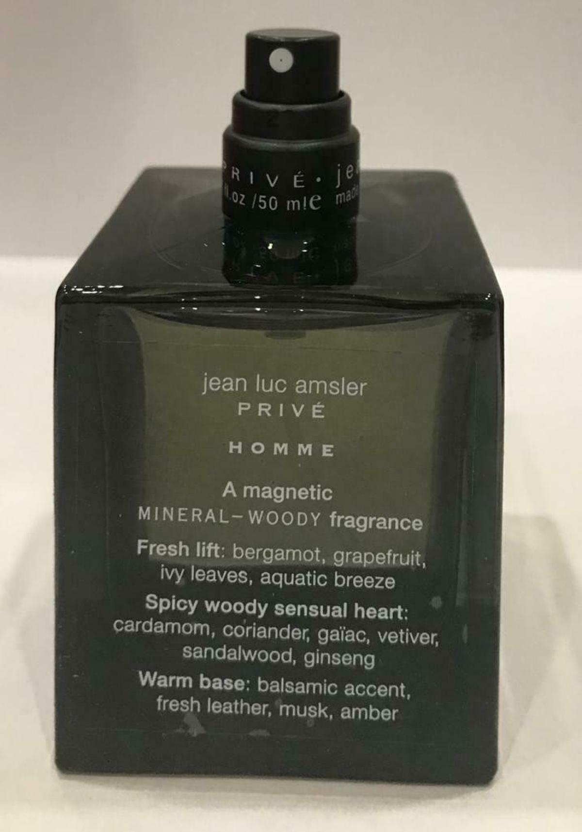 Jean Luc Amsler Prive Homme podle Jean Luc Amsler je Woody Aquatic vůně pro muže. Jean Luc Amsler Prive Homme byl/a uveden/a v roce 2001. "Nosem" za touto vůní je Marc Chevrier. Vrchní tóny jsou Vodní tóny, Břečťan, Bergamot a Grapefruit; střední tóny jsouŽenšen, Ambrette (přírodní pižmo), Vetiver, Kořen orris, Santalové dřevo, Kardamom, Koriandr a Guajakové dřevo ; základní tóny jsou Kůže, Pižmo, Styrax, Kanadský balzám a Jantar (ambra).