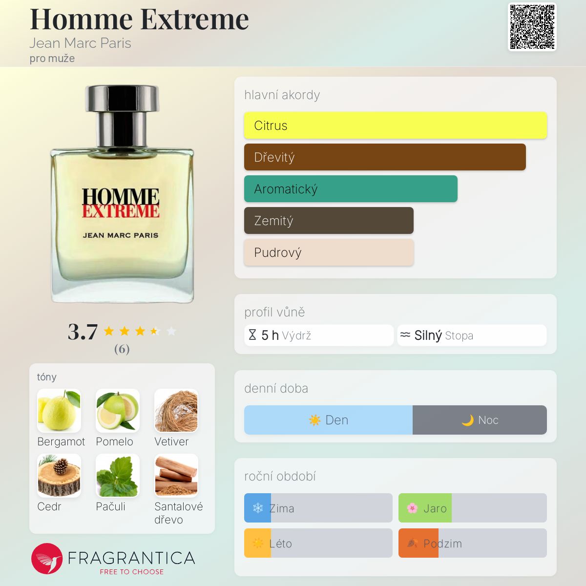 Homme Extreme podle Jean Marc Paris je Citrus vůně pro muže. Homme Extreme byl/a uveden/a v roce 2021. "Nosem" za touto vůní je Jean-Marc Chaillan. Vrchní tóny jsou Bergamot a Pomelo; střední tóny jsouVetiver, Cedr, Pačuli a Muškátový oříšek ; základní tóny jsou Santalové dřevo, Pižmo a Jantar (ambra).