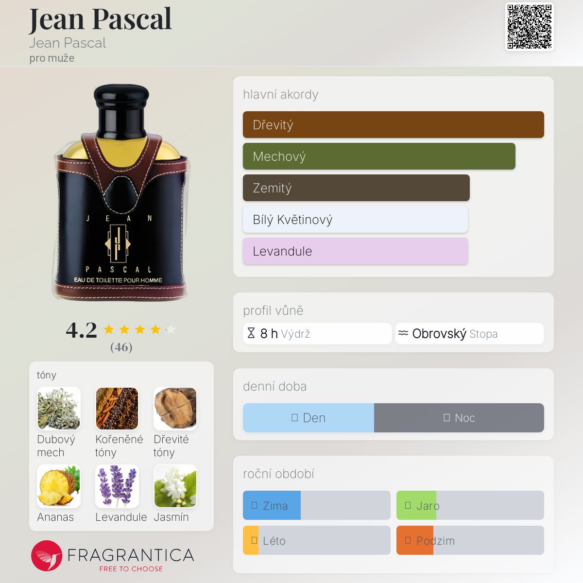 Jean Pascal podle Jean Pascal je Aromatic Fougere vůně pro muže. Jean Pascal byla spuštěna během 1980. Vrchní tóny jsou Koření, Ananas, Zelené tóny a Bergamot; střední tóny jsouLevandule a Jasmín ; základní tóny jsou Dubový mech, Dřevité tóny, Pižmo a Jantar (ambra).