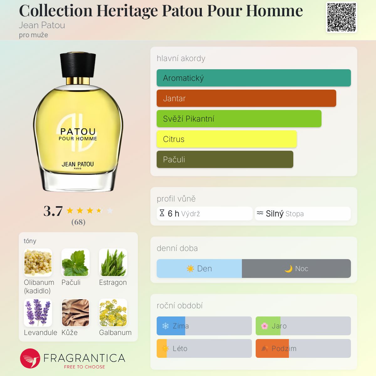 Collection Heritage Patou Pour Homme podle Jean Patou je Leather vůně pro muže. Collection Heritage Patou Pour Homme byl/a uveden/a v roce 2013. "Nosem" za touto vůní je Thomas Fontaine. Vrchní tóny jsou Galbanum, Bergamot, Citrón a Pepř; střední tóny jsouEstragon, Levandule, Fialkové listy, Jasmín a Růže ; základní tóny jsou Olibanum, Pačuli, Kůže a Ambra.