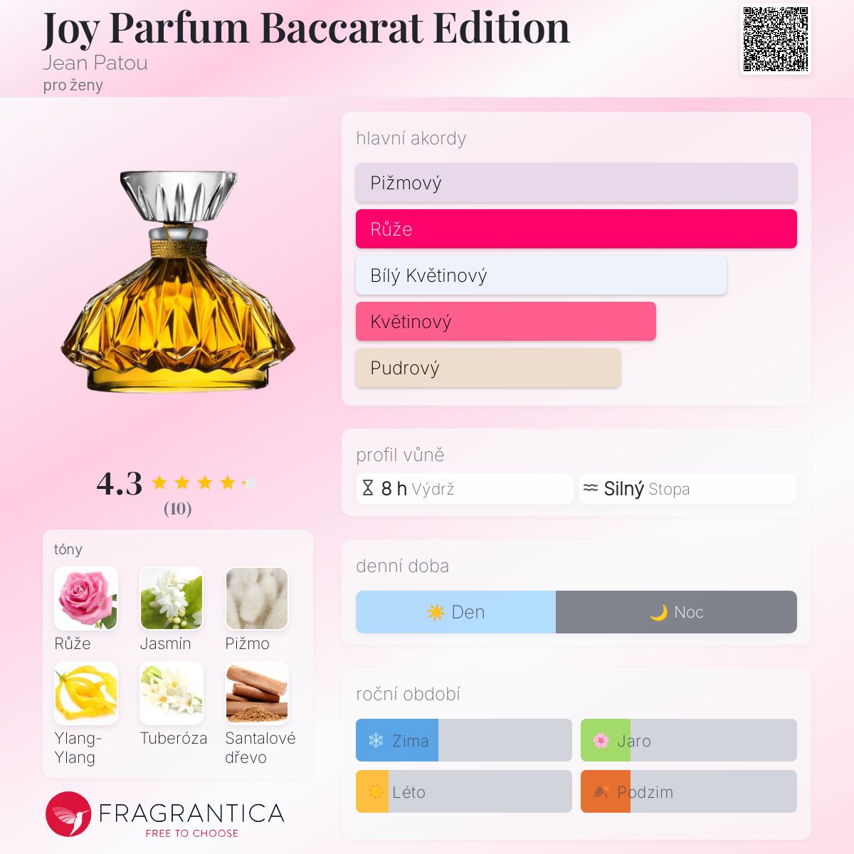 Joy Parfum Baccarat Edition podle Jean Patou je Floral vůně pro ženy. Vrchní tóny jsou Bulharská růže, Ylang-Ylang a Tuberóza; střední tóny jsouJasmín a Růže májová ; základní tóny jsou Pižmo a Santalové dřevo.