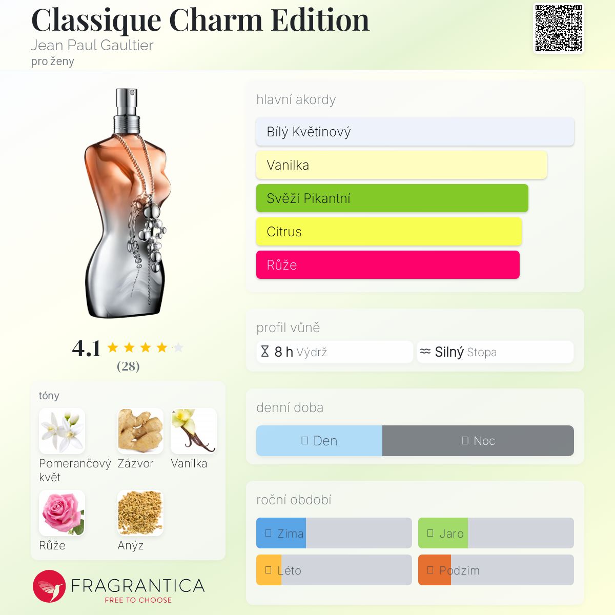 Classique Charm Edition podle Jean Paul Gaultier je Orientální Floral vůně pro ženy. Classique Charm Edition byl/a uveden/a v roce 2010. Vrchní tóny jsou Zázvor a Anýz; střední tóny jsouKvět afrického pomeranče a Růže ; základní tón je Vanilka.