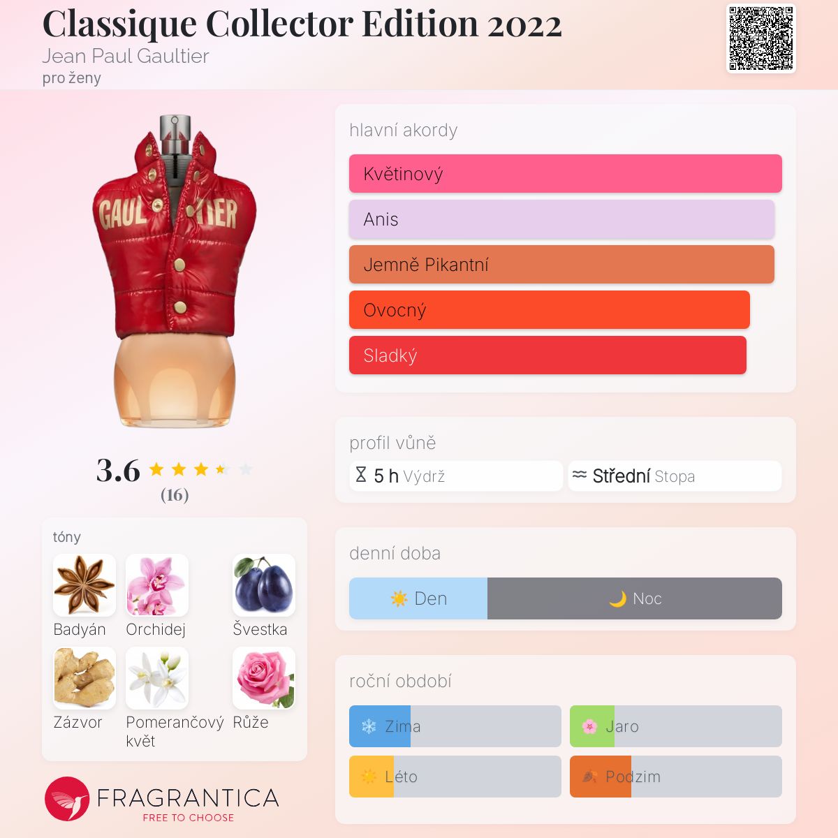 Classique Collector Edition 2022 podle Jean Paul Gaultier je Orientální Floral vůně pro ženy. Classique Collector Edition 2022 byl/a uveden/a v roce 2022. "Nosem" za touto vůní je Jacques Cavallier Belletrud. Vrchní tóny jsou Badyán, Pomerančový květ, Růže, Mandarinka, Hruška a Bergamot; střední tóny jsouOrchidej, Švestka, Zázvor, Ylang-Ylang, Kosatec a Tuberóza ; základní tóny jsou Vanilka, Jantar (ambra), Pižmo, Skořice a Santalové dřevo.