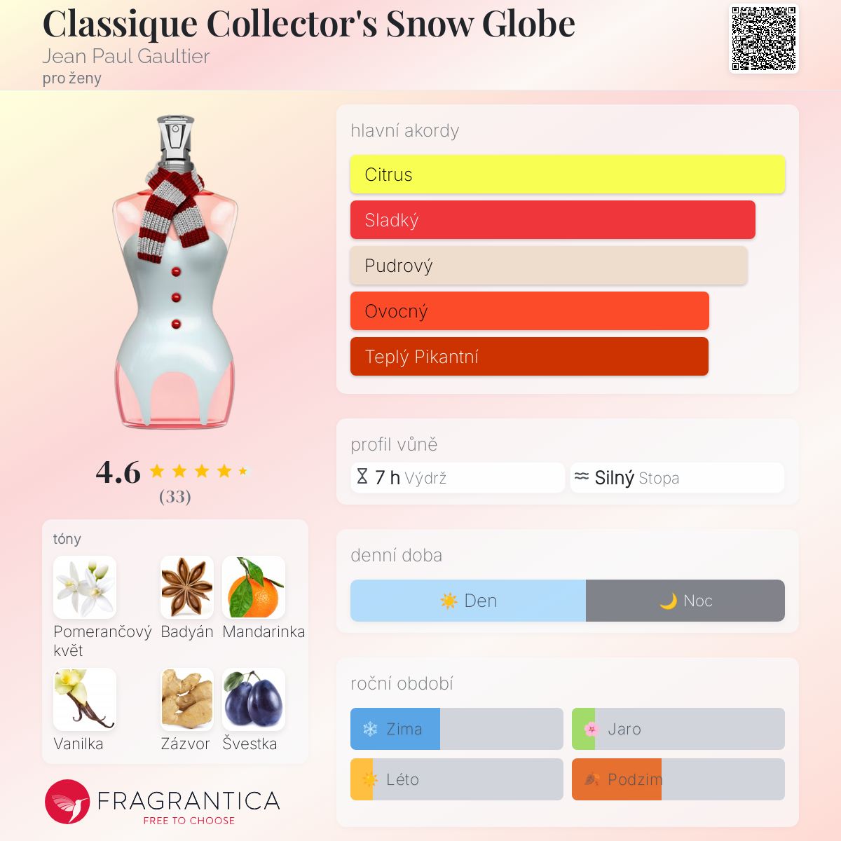 Classique Collector's Snow Globe podle Jean Paul Gaultier je Orientální Floral vůně pro ženy. Classique Collector's Snow Globe byl/a uveden/a v roce 2019. "Nosem" za touto vůní je Jacques Cavallier Belletrud. Vrchní tóny jsou Pomerančový květ, Badyán, Mandarinka, Hruška, Bergamot a Růže; střední tóny jsouZázvor, Švestka, Orchidej, Kosatec, Ylang-Ylang a Tuberóza ; základní tóny jsou Vanilka, Pižmo, Jantar (ambra), Santalové dřevo a Skořice.
