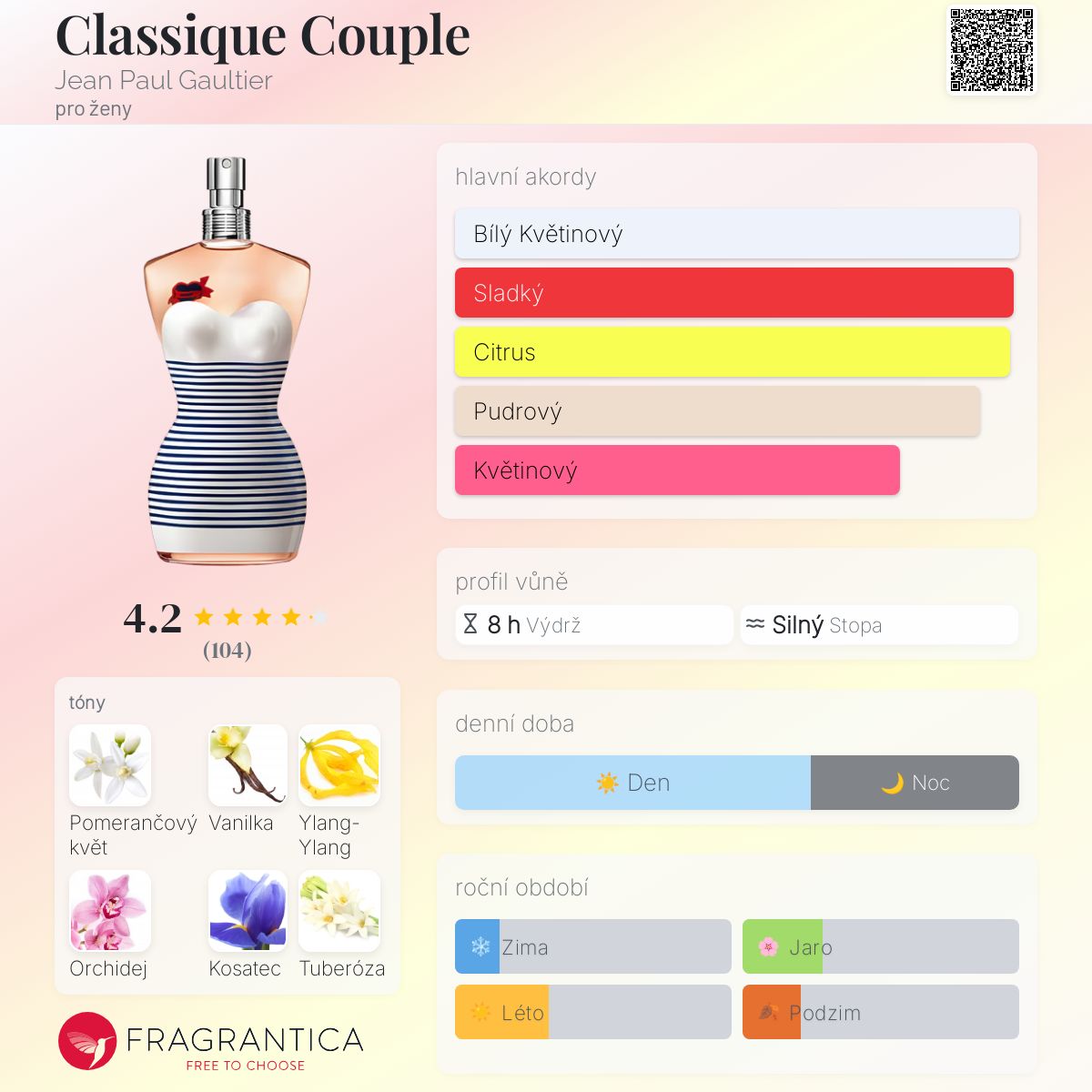 Classique Couple podle Jean Paul Gaultier je Orientální Floral vůně pro ženy. Classique Couple byl/a uveden/a v roce 2013. Vrchní tóny jsou Pomerančový květ, Bergamot, Badyán, Růže, Mandarinka a Hruška; střední tóny jsouYlang-Ylang, Orchidej, Kosatec, Tuberóza, Zázvor a Švestka ; základní tóny jsou Vanilka, Jantar (ambra), Santalové dřevo, Skořice a Pižmo.