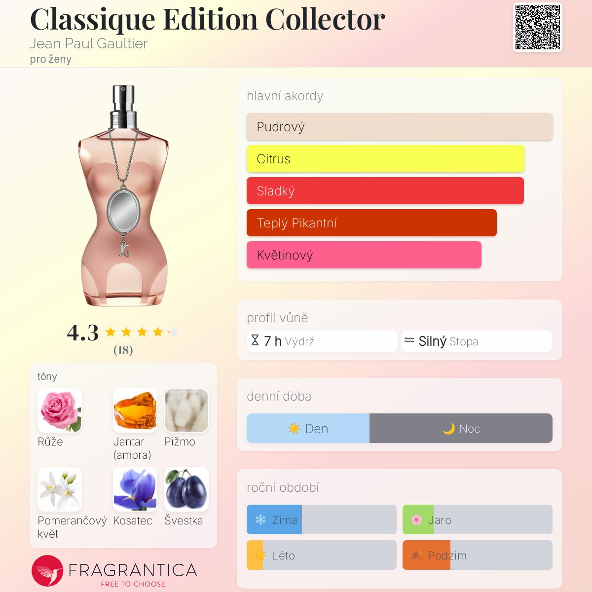 Classique Edition Collector podle Jean Paul Gaultier je Orientální Floral vůně pro ženy. Classique Edition Collector byl/a uveden/a v roce 2014. "Nosem" za touto vůní je Jacques Cavallier Belletrud. Vrchní tóny jsou Růže, Pomerančový květ, Bergamot, Badyán, Hruška a Mandarinka; střední tóny jsouKosatec, Švestka, Zázvor, Orchidej, Ylang-Ylang a Tuberóza ; základní tóny jsou Jantar (ambra), Pižmo, Skořice, Vanilka a Santalové dřevo.