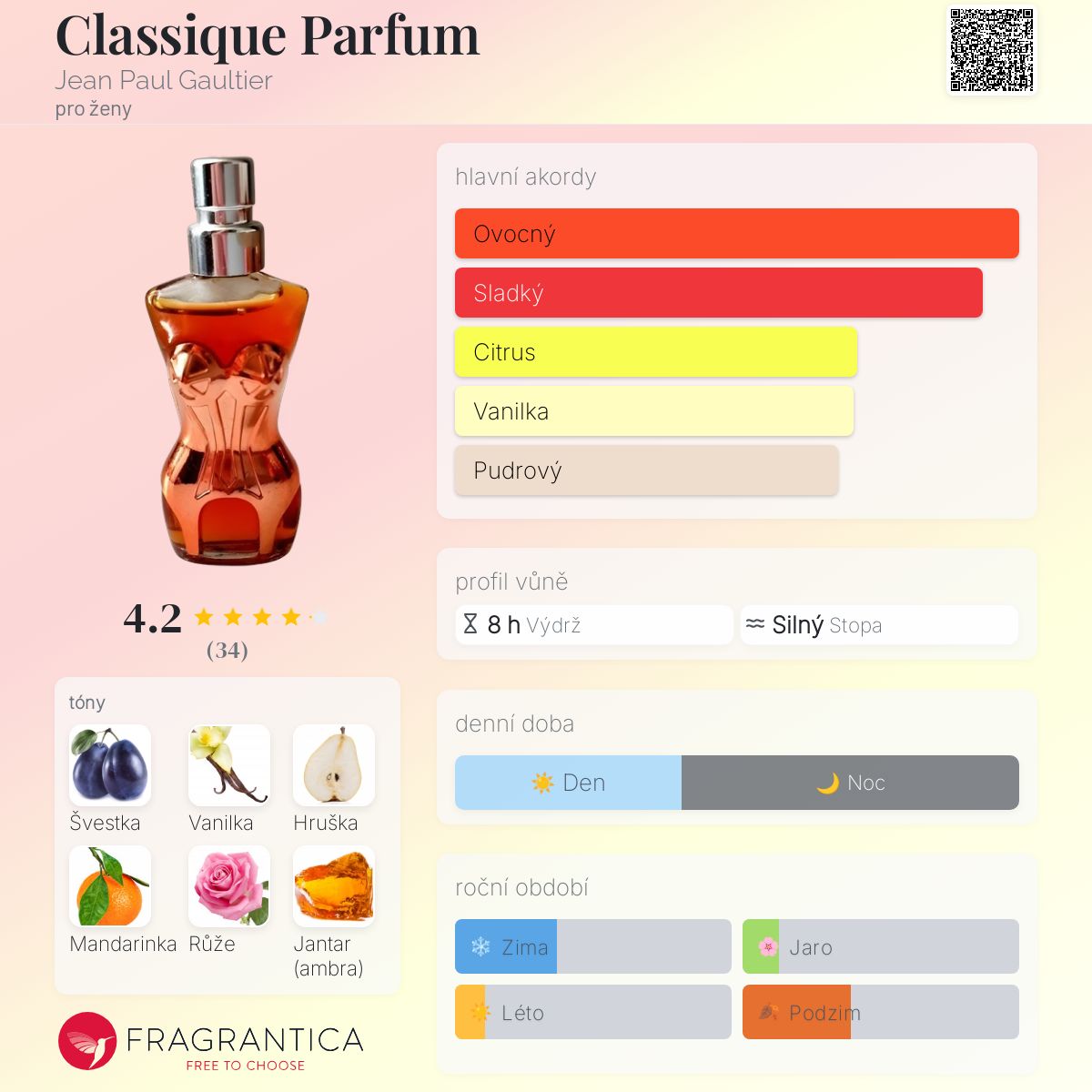 Classique Parfum podle Jean Paul Gaultier je Floral vůně pro ženy. Classique Parfum byl/a uveden/a v roce 1993. "Nosem" za touto vůní je Jacques Cavallier Belletrud. Vrchní tóny jsou Hruška, Mandarinka, Růže, Pomerančový květ a Badyán; střední tóny jsouŠvestka, Orchidej, Ylang-Ylang, Zázvor a Kosatec ; základní tóny jsou Vanilka, Jantar (ambra) a Pižmo.