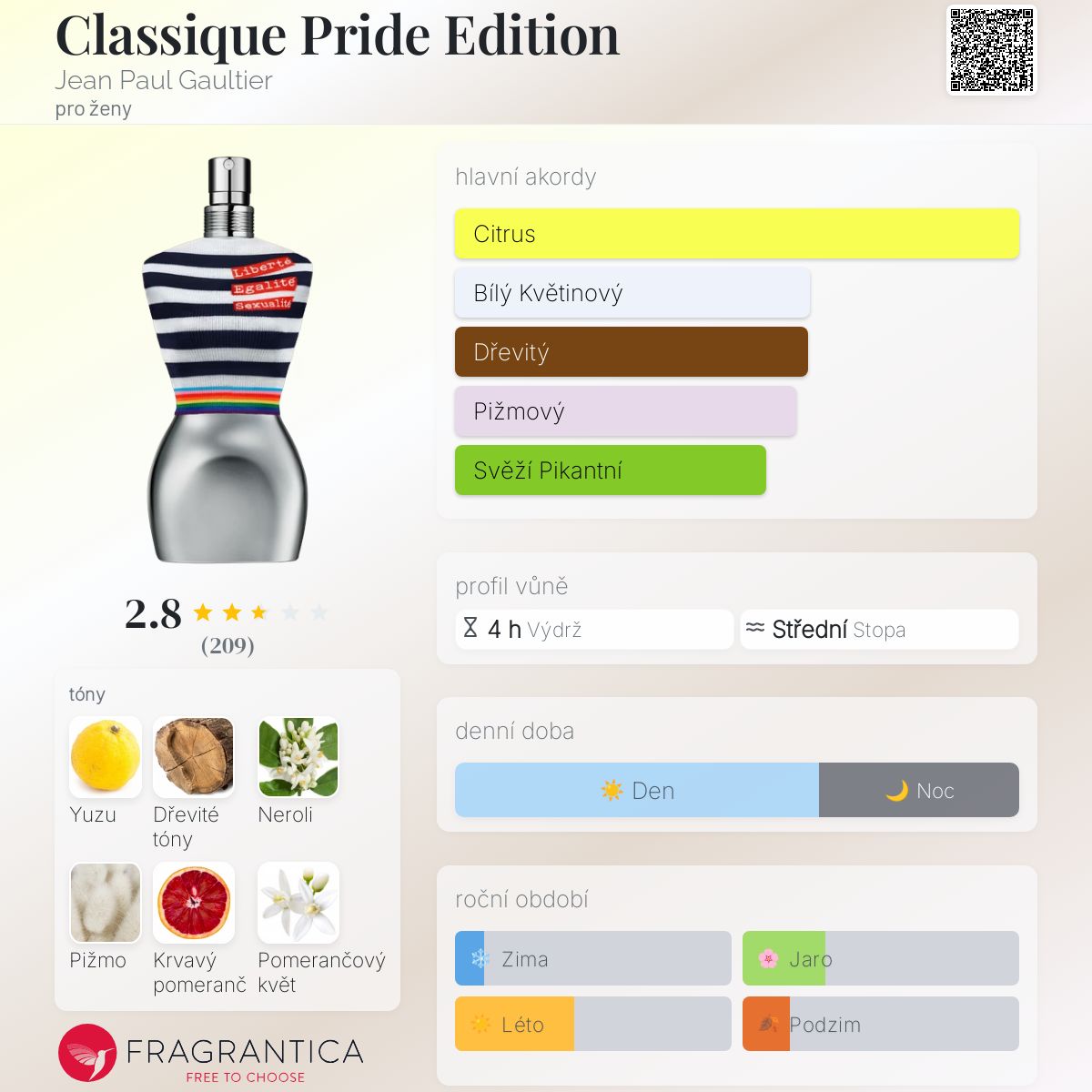 Classique Pride Edition podle Jean Paul Gaultier je Floral Woody Musk vůně pro ženy. Classique Pride Edition byl/a uveden/a v roce 2022. Classique Pride Edition byl/a vytvořen/a Natalie Gracia-Cetto a Quentin Bisch. Vrchní tóny jsou Yuzu a Krvavý pomeranč; střední tóny jsouNeroli a Pomerančový květ ; základní tóny jsou Bílé dřevo a Pižmo.