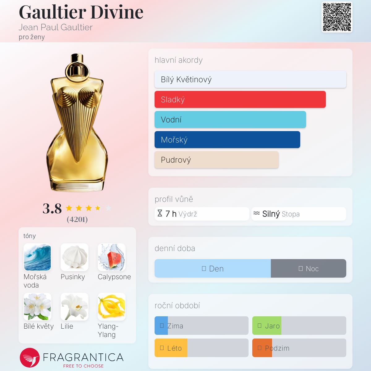 Gaultier Divine podle Jean Paul Gaultier je Orientální Floral vůně pro ženy. Toto je nová vůně. Gaultier Divine byl/a uveden/a v roce 2023. "Nosem" za touto vůní je Quentin Bisch. Vrchní tóny jsou Calypsone, Bergamot a Červené bobule; střední tóny jsouLilie, Ylang-Ylang a Jasmín ; základní tóny jsou Sněhová pusinka, Pižmo a Pačuli.