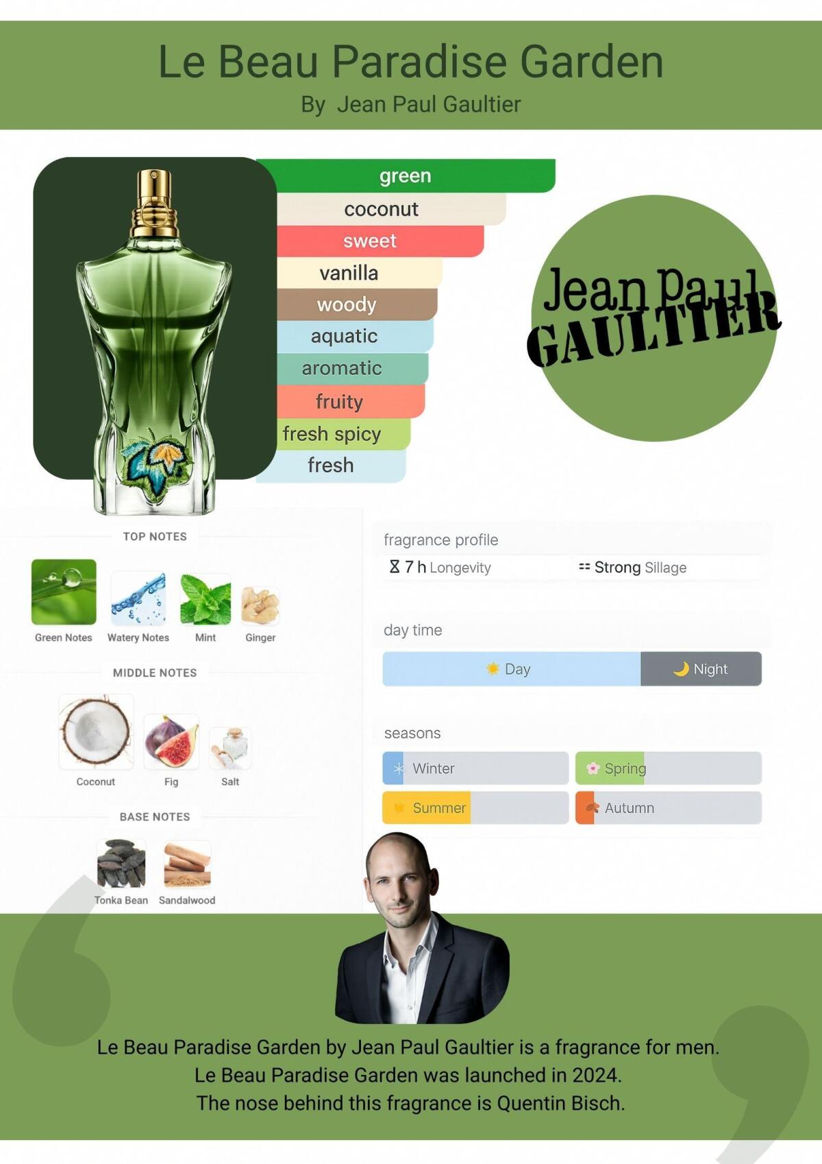 Nádherná vůně, které dominuje svěží máta a mléčný kokos vykoupaný v soli, místy připomínající opalovací krém. Velmi podobná parfému JPG Le Beau Le Parfum, ale bez ananasového nádechu. Brutální délka a stopa. Flakon je těžký a velmi pěkný. Další mistrovské dílo JPG. (Ne, nezlobte se na mě, to jsem si vymyslela, ale když vidím, že už je tu spousta hlasů o tom, jestli ji milujete, nebo nenávidíte, o sezóně, výdrži, ceně, stopě a pohlaví u vůně, která má ještě pár měsíců do vydání, rozhodla jsem se zúčastnit).
