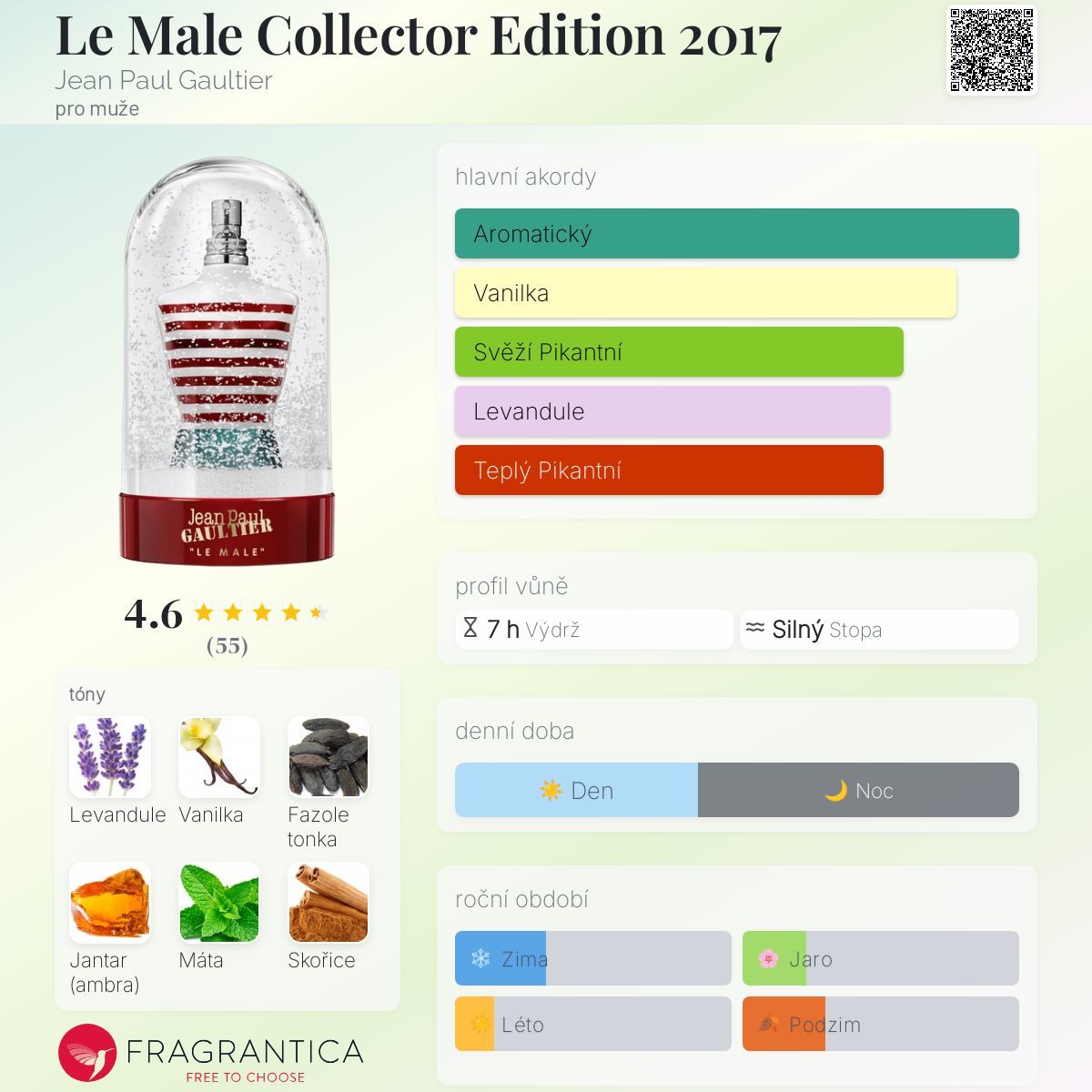 Le Male Collector Edition 2017 podle Jean Paul Gaultier je Orientální Fougere vůně pro muže. Le Male Collector Edition 2017 byl/a uveden/a v roce 2017. Vrchní tóny jsou Levandule, Máta, Kardamom, Pelyněk a Bergamot; střední tóny jsouSkořice, Pomerančový květ a Kmín ; základní tóny jsou Vanilka, Fazole tonka, Jantar (ambra), Santalové dřevo a Cedr.