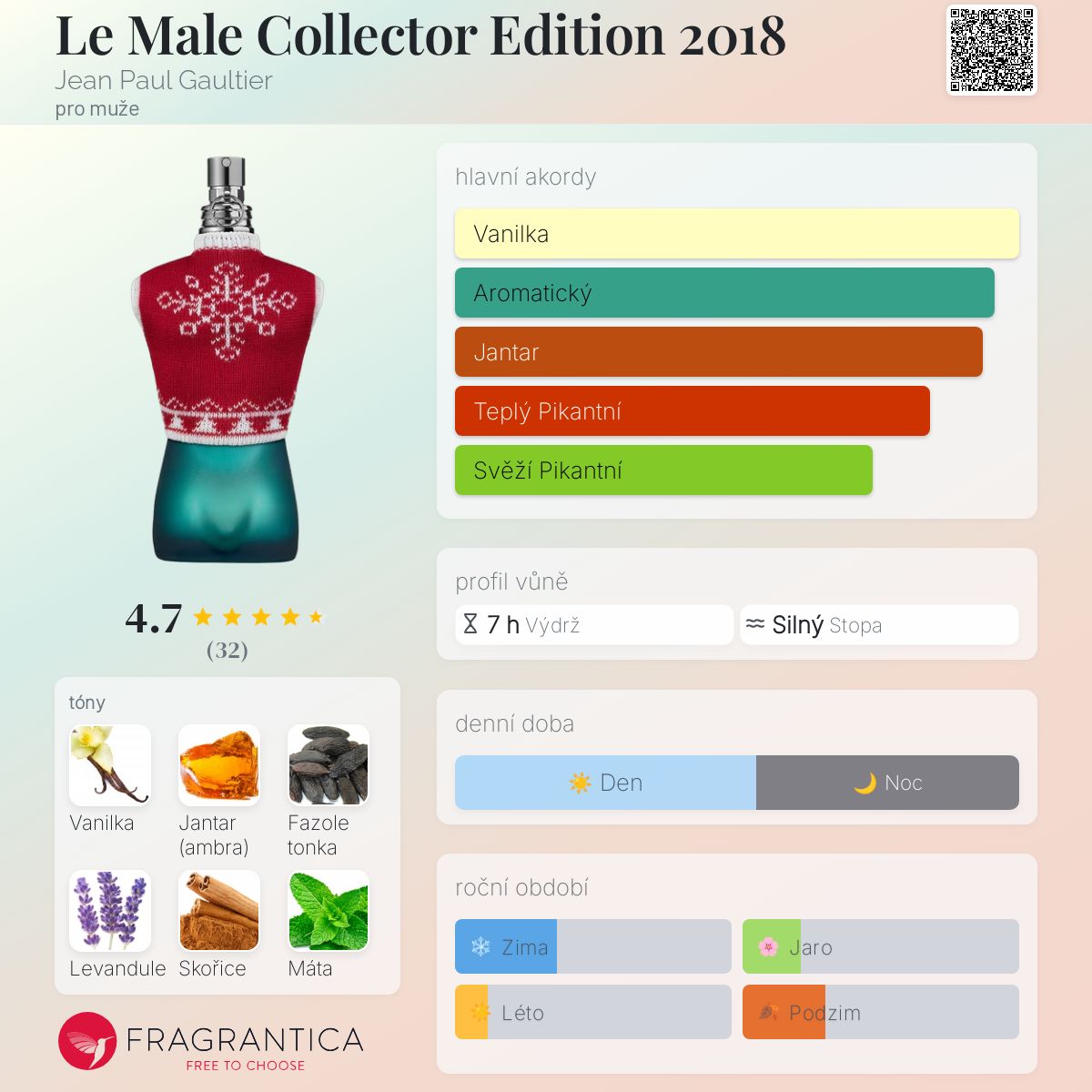 Le Male Collector Edition 2018 podle Jean Paul Gaultier je Orientální Fougere vůně pro muže. Le Male Collector Edition 2018 byl/a uveden/a v roce 2018. Vrchní tóny jsou Levandule, Máta, Kardamom, Pelyněk a Bergamot; střední tóny jsouSkořice, Pomerančový květ a Kmín ; základní tóny jsou Vanilka, Jantar (ambra), Fazole tonka, Cedr a Santalové dřevo.