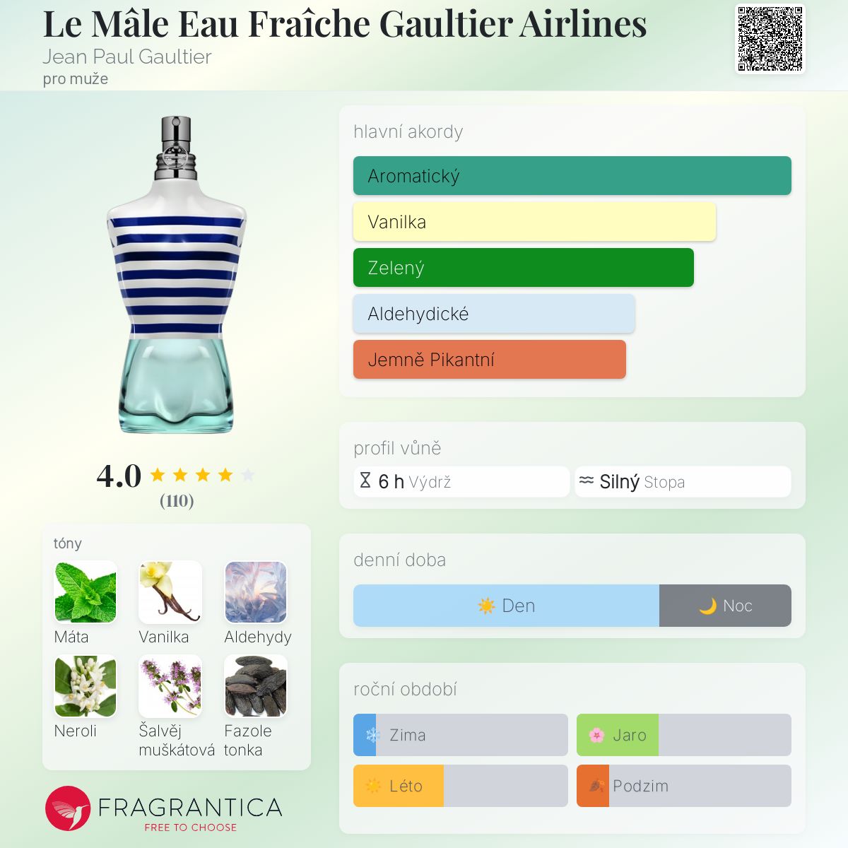 Le Mâle Eau Fraîche Gaultier Airlines podle Jean Paul Gaultier je Aromatic Fougere vůně pro muže. Le Mâle Eau Fraîche Gaultier Airlines byl/a uveden/a v roce 2018. "Nosem" za touto vůní je Natalie Gracia-Cetto. Vrchní tóny jsou Máta, Aldehydy a Neroli; střední tóny jsouŠalvěj muškátová, Šalvěj, Dřevité tóny a Jantar (ambra) ; základní tóny jsou Vanilka, Fazole tonka a Santalové dřevo.