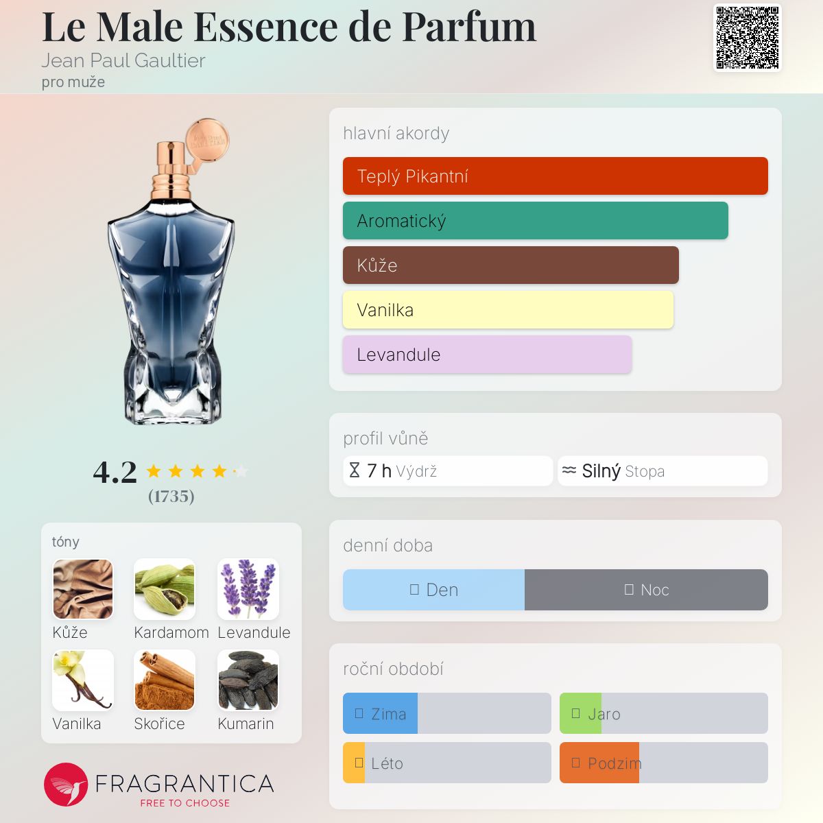 Le Male Essence de Parfum podle Jean Paul Gaultier je Orientální Fougere vůně pro muže. Le Male Essence de Parfum byl/a uveden/a v roce 2016. "Nosem" za touto vůní je Quentin Bisch. Vrchní tóny jsou Kardamom, Pepř, Pelyněk a Bergamot; střední tóny jsouKůže, Levandule, Skořice a Šalvěj ; základní tóny jsou Vanilka, Kumarin, Jantarové dřevo, Pižmo a Chrpovník lopuchový.