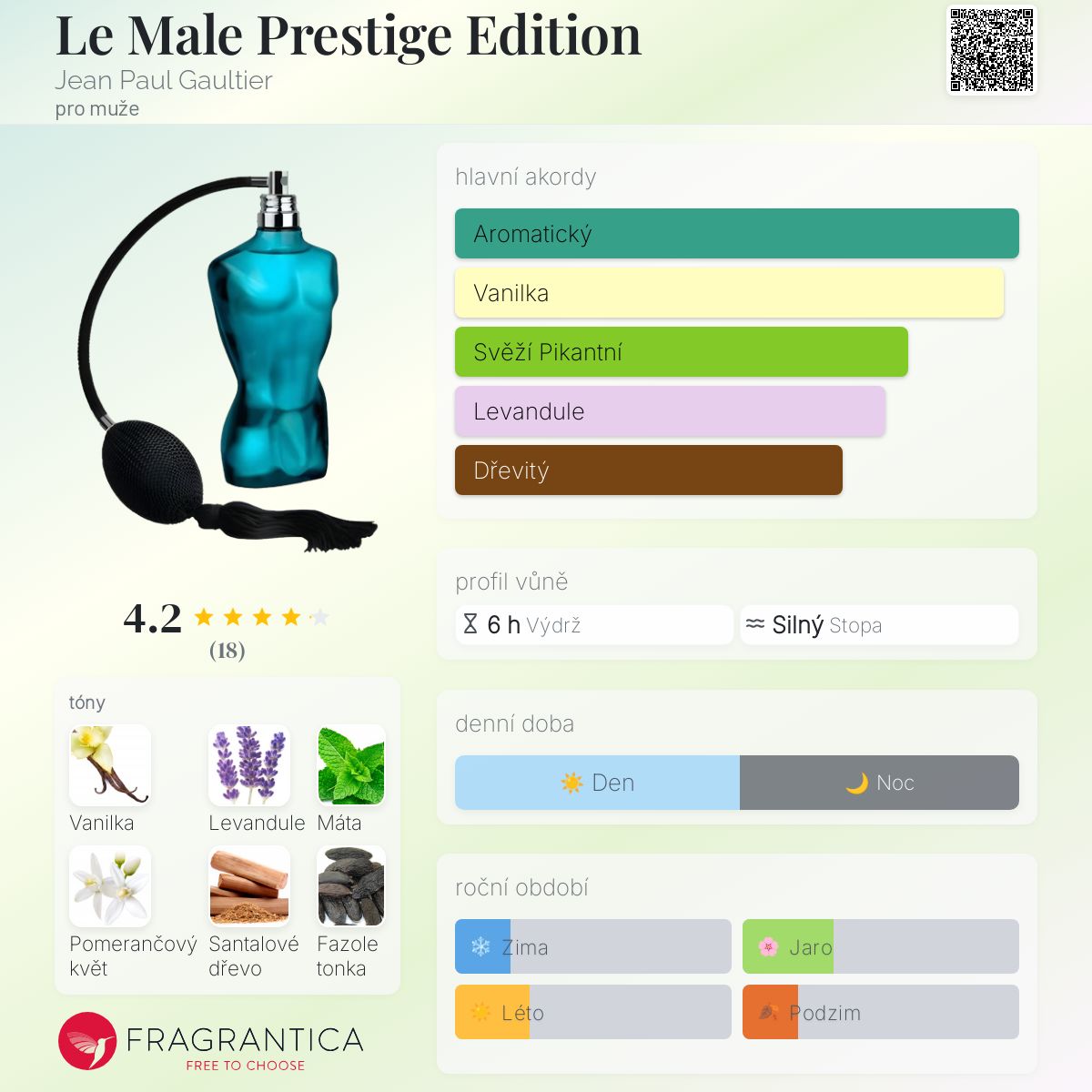 Le Male Prestige Edition podle Jean Paul Gaultier je Orientální Fougere vůně pro muže. Le Male Prestige Edition byl/a uveden/a v roce 2010. Vrchní tóny jsou Levandule, Máta, Bergamot, Pelyněk a Kardamom; střední tóny jsouPomerančový květ, Kmín a Skořice ; základní tóny jsou Vanilka, Santalové dřevo, Fazole tonka, Jantar (ambra) a Cedr.