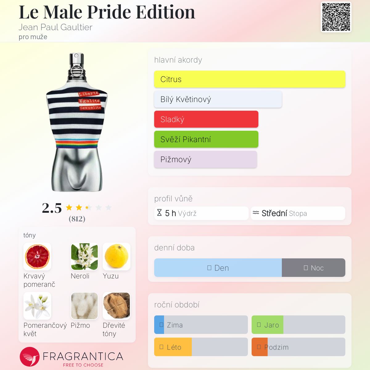 Le Male Pride Edition podle Jean Paul Gaultier je Citrus Aromatic vůně pro muže. Toto je nová vůně. Le Male Pride Edition byl/a uveden/a v roce 2022. Le Male Pride Edition byl/a vytvořen/a Natalie Gracia-Cetto a Quentin Bisch. Vrchní tóny jsou Krvavý pomeranč a Yuzu; střední tóny jsouNeroli a Pomerančový květ ; základní tóny jsou Pižmo a Bílé dřevo.
