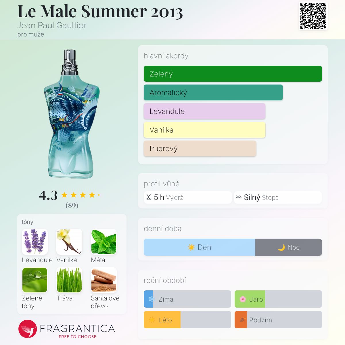 Le Male Summer 2013 podle Jean Paul Gaultier je Aromatic vůně pro muže. Le Male Summer 2013 byl/a uveden/a v roce 2013. Vrchní tóny jsou Levandule, Máta a Kardamom; střední tóny jsouZelené listí a Tráva ; základní tóny jsou Vanilka, Santalové dřevo a Pižmo.