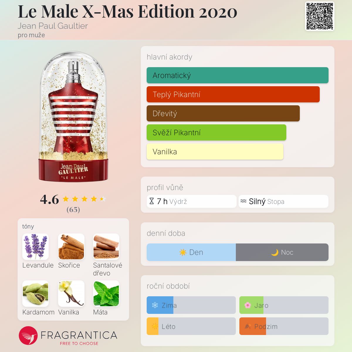 Le Male X-Mas Edition 2020 podle Jean Paul Gaultier je Orientální Fougere vůně pro muže. Le Male X-Mas Edition 2020 byl/a uveden/a v roce 2020. "Nosem" za touto vůní je Francis Kurkdjian. Vrchní tóny jsou Levandule, Kardamom, Máta, Pelyněk a Bergamot; střední tóny jsouSkořice, Pomerančový květ a Kmín ; základní tóny jsou Santalové dřevo, Vanilka, Fazole tonka, Cedr a Jantar (ambra).