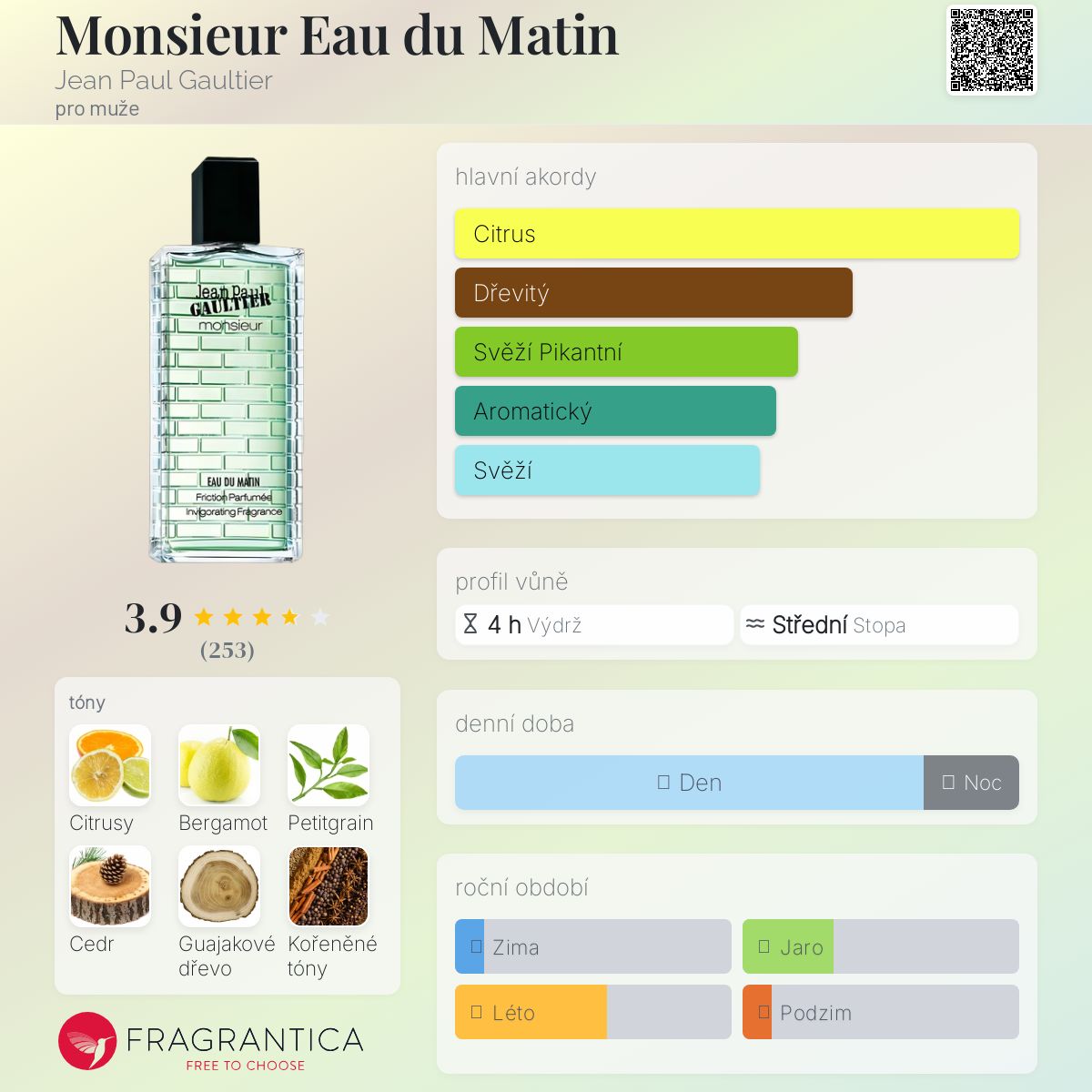 Monsieur Eau du Matin podle Jean Paul Gaultier je Woody Aromatic vůně pro muže. Monsieur Eau du Matin byl/a uveden/a v roce 2008. "Nosem" za touto vůní je Francis Kurkdjian. Vrchní tóny jsou Citrusy a Bergamot; střední tóny jsouPetitgrain a Koření ; základní tóny jsou Cedr a Guajakové dřevo.