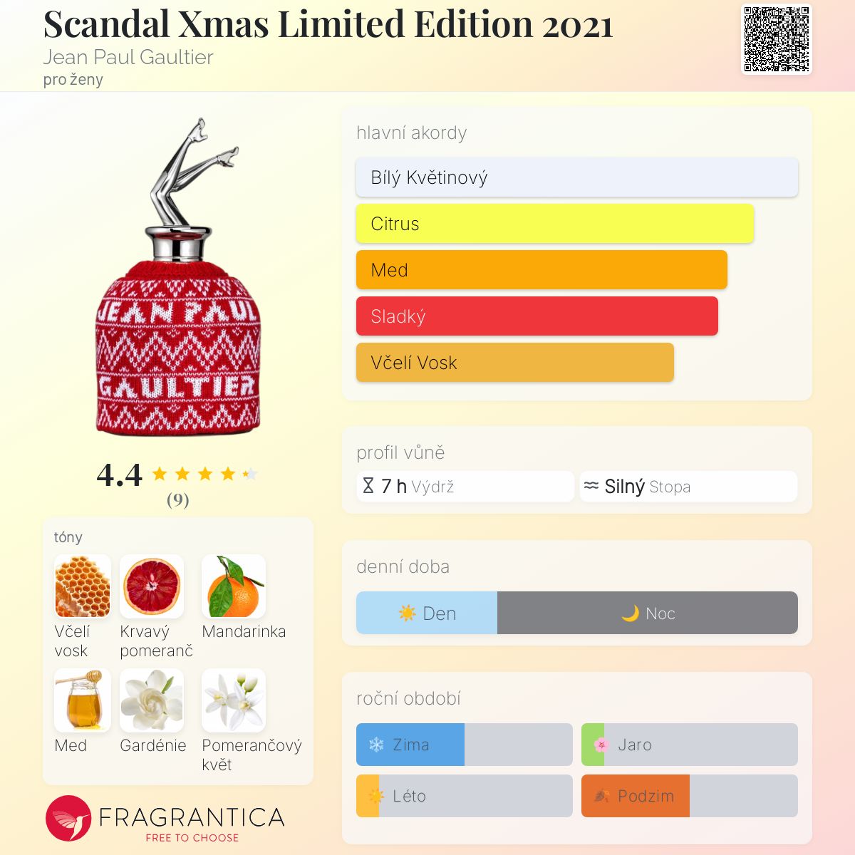 Scandal Xmas Limited Edition 2021 podle Jean Paul Gaultier je Chypre Floral vůně pro ženy. Scandal Xmas Limited Edition 2021 byl/a uveden/a v roce 2021. Scandal Xmas Limited Edition 2021 byl/a vytvořen/a Christophe Raynaud, Daphné Bugey a Fabrice Pellegrin. Vrchní tóny jsou Krvavý pomeranč a Mandarinka; střední tóny jsouMed, Gardénie, Pomerančový květ, Jasmín a Broskev ; základní tóny jsou Včelí vosk, Karamel, Pačuli a Lékořice.