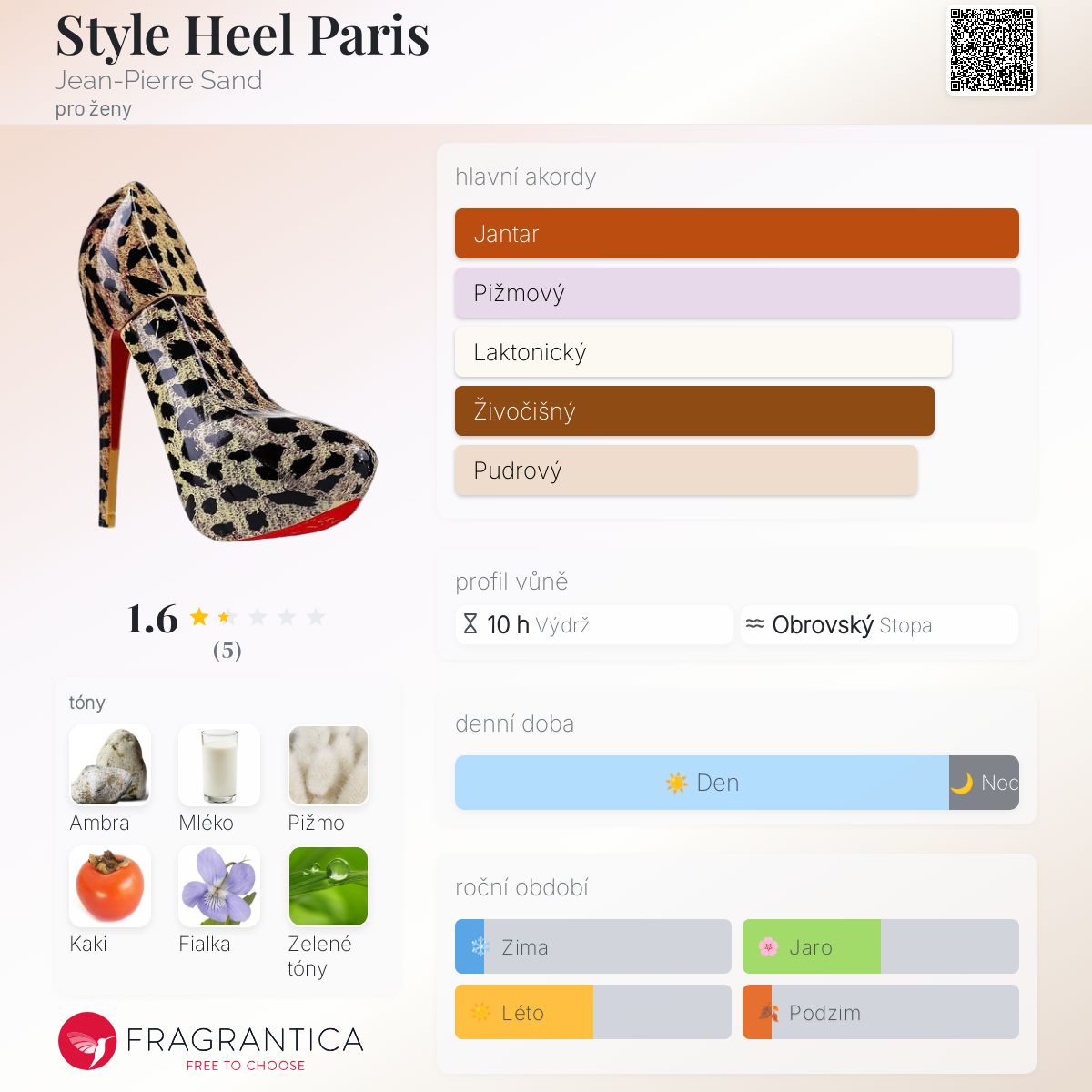 Style Heel Paris podle Jean-Pierre Sand je Floral vůně pro ženy. Style Heel Paris byl/a uveden/a v roce 2021. Vrchní tóny jsou Kaki, Zelené tóny a Granátové jablko; střední tóny jsouMagnólie champaca, Lotus a Černá orchidej ; základní tóny jsou Ambra, Mléko, Bílé pižmo, Fialka a Mahagon.