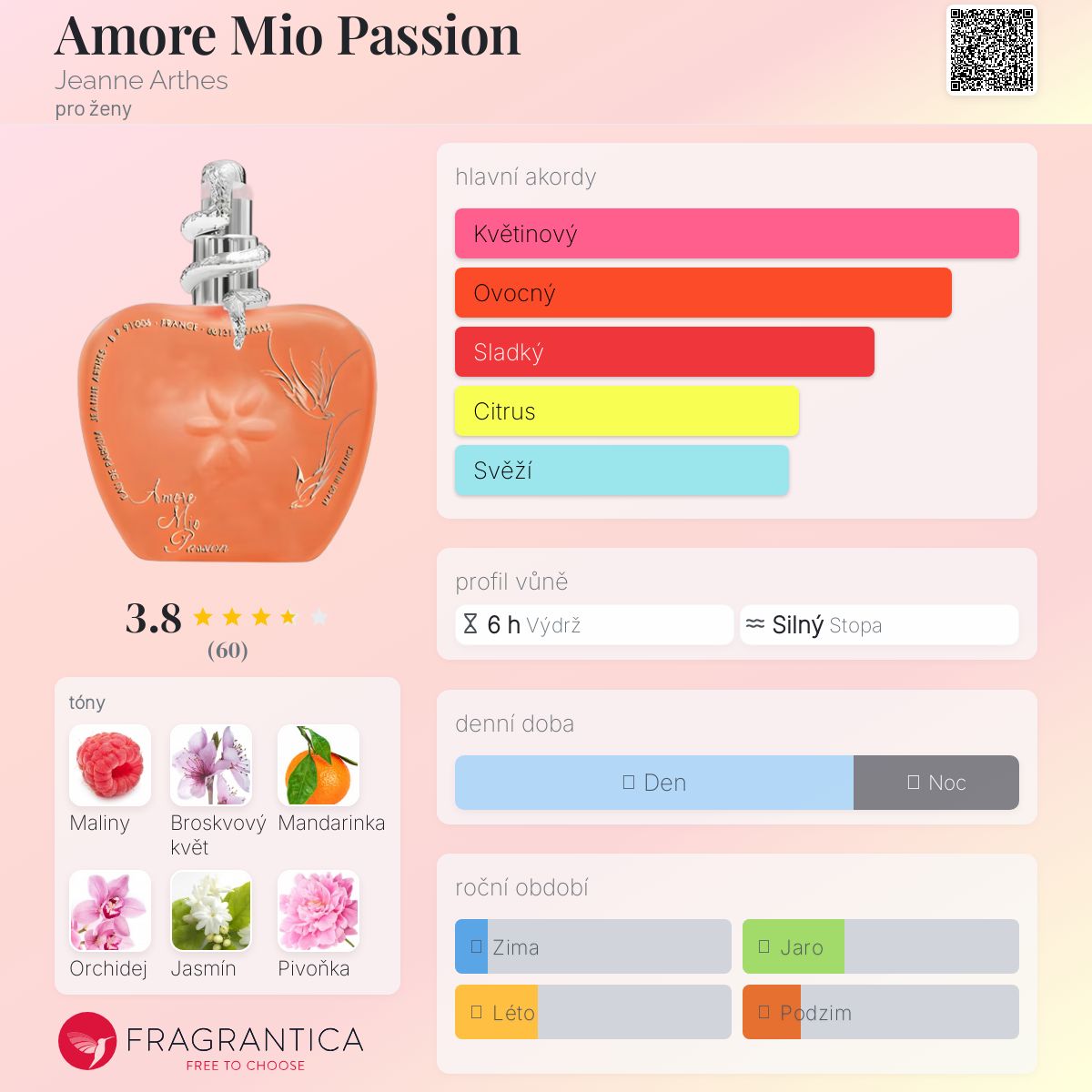 Amore Mio Passion podle Jeanne Arthes je Floral Fruity vůně pro ženy. Amore Mio Passion byl/a uveden/a v roce 2014. Vrchní tóny jsou Maliny, Broskvový květ a Mandarinka; střední tóny jsouOrchidej, Jasmín a Pivoňka ; základní tóny jsou Kašmírové dřevo, Vanilka, Bílé pižmo a Pačuli.
