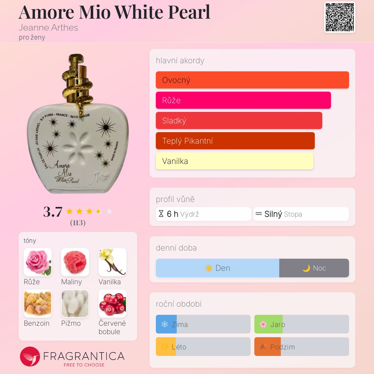 Amore Mio White Pearl podle Jeanne Arthes je Floral Fruity vůně pro ženy. Amore Mio White Pearl byl/a uveden/a v roce 2015. Vrchní tóny jsou Červené bobule a Červená paprička; střední tóny jsouRůže a Maliny ; základní tóny jsou Vanilka, Benzoin, Pižmo a Pačuli.
