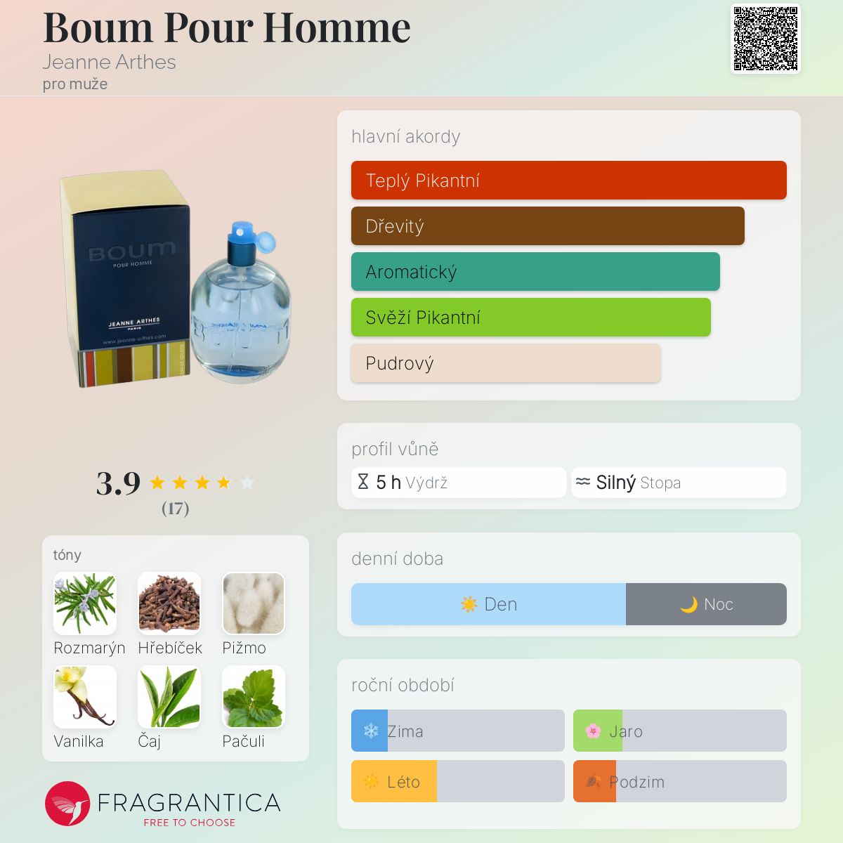 Boum Pour Homme podle Jeanne Arthes je Woody Spicy vůně pro muže. Vrchní tóny jsou Rozmarýn a Citrón; střední tóny jsouHřebíček, Čaj, Muškátový oříšek, Kardamom, Jasmín a Lilie ; základní tóny jsou Pižmo, Vanilka, Pačuli, Santalové dřevo a Cedr.