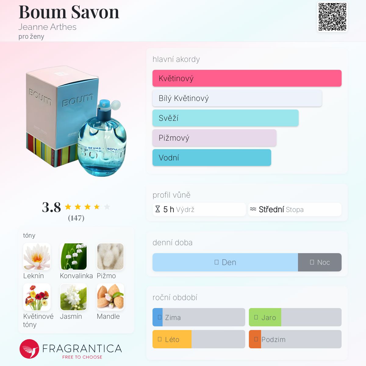 Boum Savon podle Jeanne Arthes je Floral vůně pro ženy. Vrchní tóny jsou Květinové tóny a Mandle; střední tóny jsouLeknín a Konvalinka ; základní tóny jsou Pižmo a Jasmín.