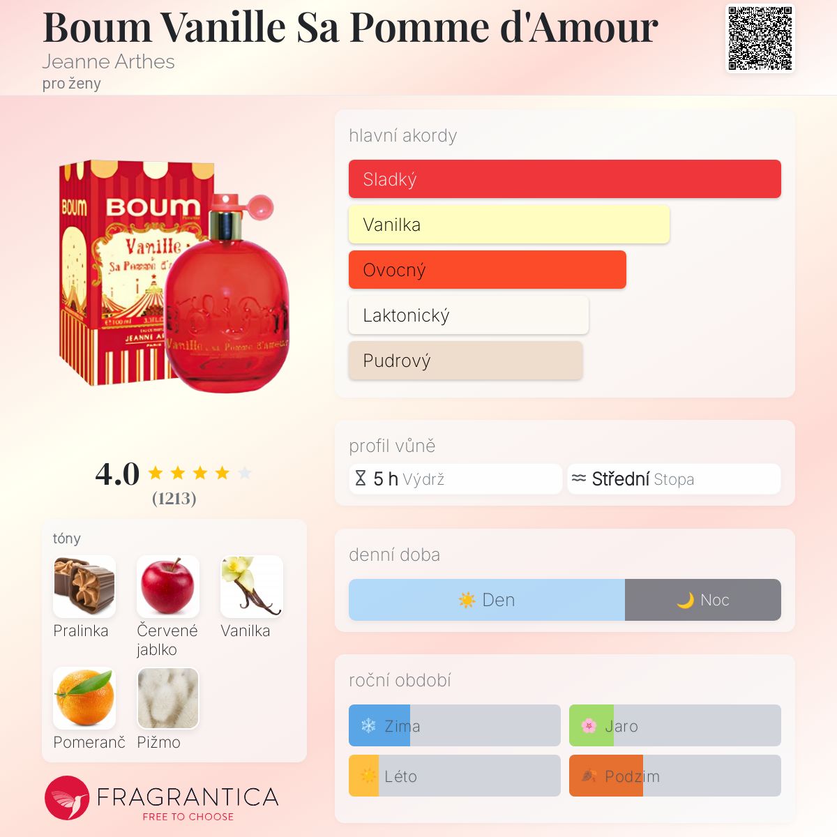 Boum Vanille Sa Pomme d'Amour podle Jeanne Arthes je Floral Fruity vůně pro ženy. Boum Vanille Sa Pomme d'Amour byl/a uveden/a v roce 2012. Vrchní tón je Pomeranč ; střední tóny jsouPralinka a Červené jablko ; základní tóny jsou Vanilka a Pižmo.