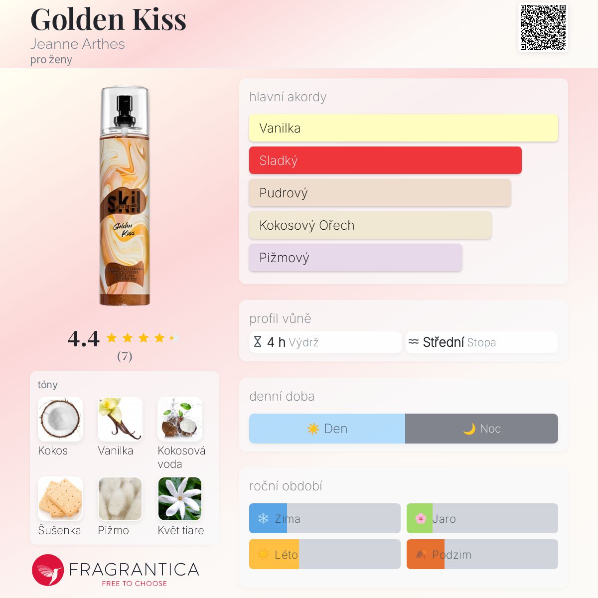 Golden Kiss podle Jeanne Arthes je vůně pro ženy. Golden Kiss byl/a uveden/a v roce 2024. Vrchní tóny jsou Kokosová voda, Květ tiare a Mandarinka; střední tóny jsouKokosové mléko, Šušenka a Otočník ; základní tóny jsou Vanilka, Pižmo a Santalové dřevo.