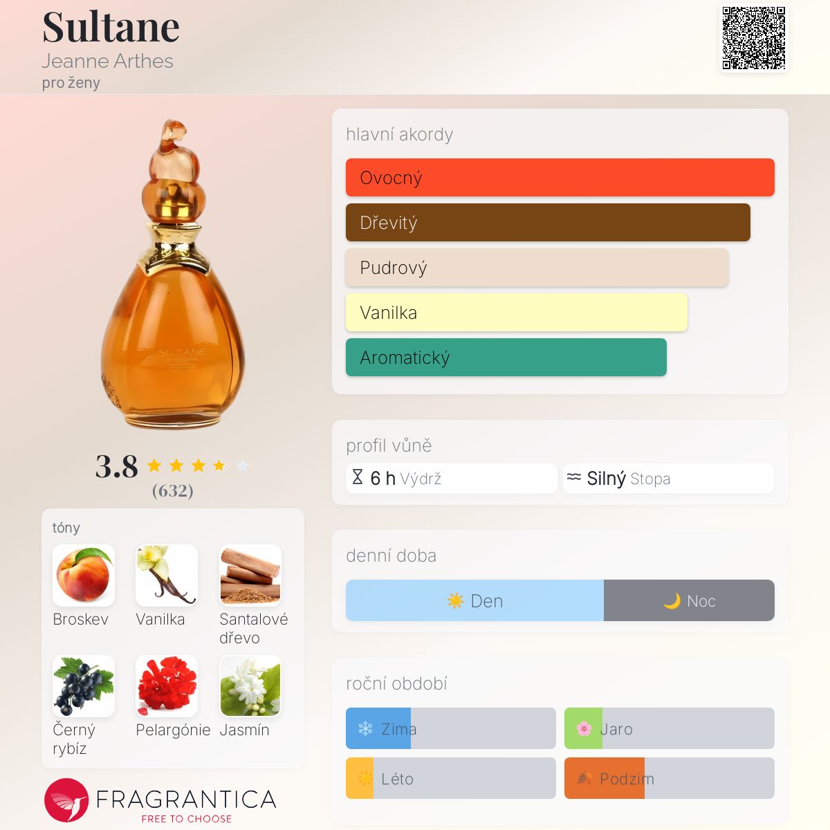 Sultane podle Jeanne Arthes je Orientální Floral vůně pro ženy. Sultane byl/a uveden/a v roce 2001. Vrchní tóny jsou Černý rybíz a Bergamot; střední tóny jsouBroskev a Jasmín ; základní tóny jsou Vanilka, Santalové dřevo, Pelargónie, Cedr, Pižmo a Levandule.